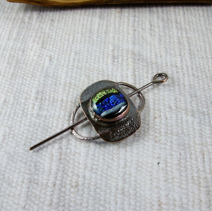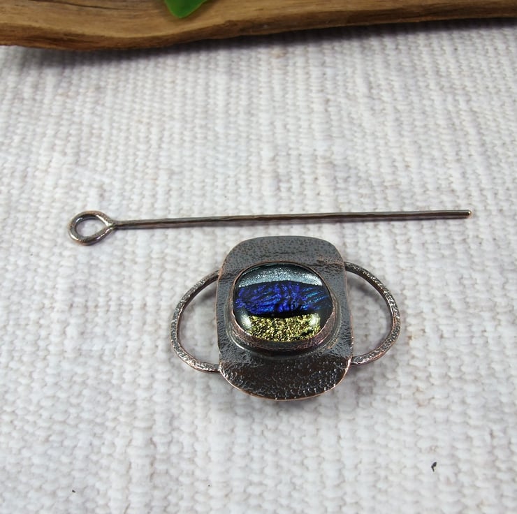 Shawl Pin Brooch. Copper with Blue Silver and Gold Dichroic Glass Cabachon