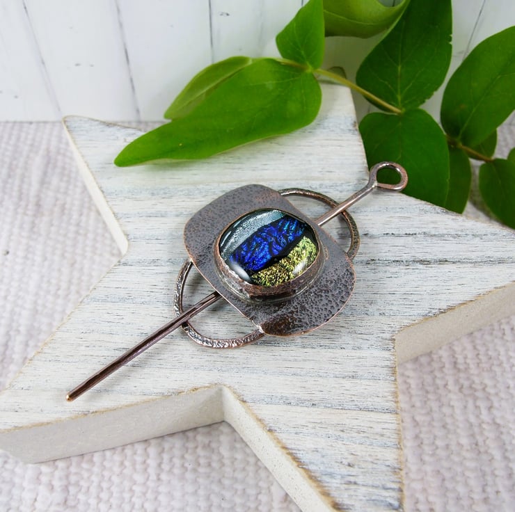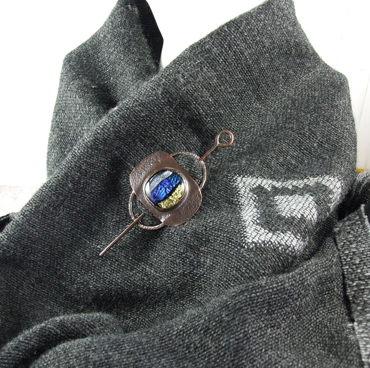 The shawl pin is a one off design in a freeform style with a copper base and pin. I created the base by shaping 2mm copper wire into an oval shape, then creating a setting for the glass cabachon. I made the dichroic glass cabachon from small fragments of patterned and coloured glass which has then been fused in my kiln.