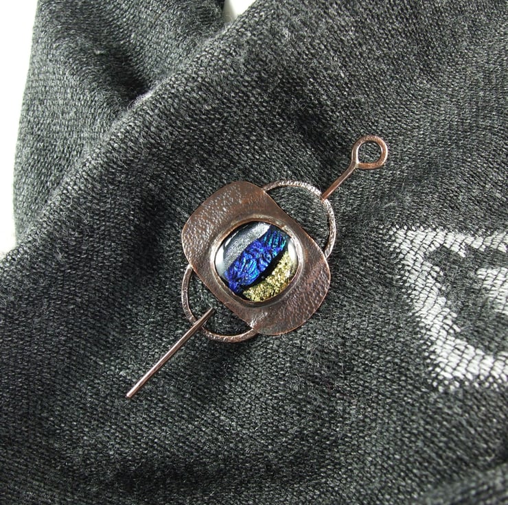 One of a kind copper shawl pin brooch with my own artisan made blue, silver and gold dichroic glass cabachon for Open Weave or Knit Shawl, Scarf, Wrap or Cardigan.