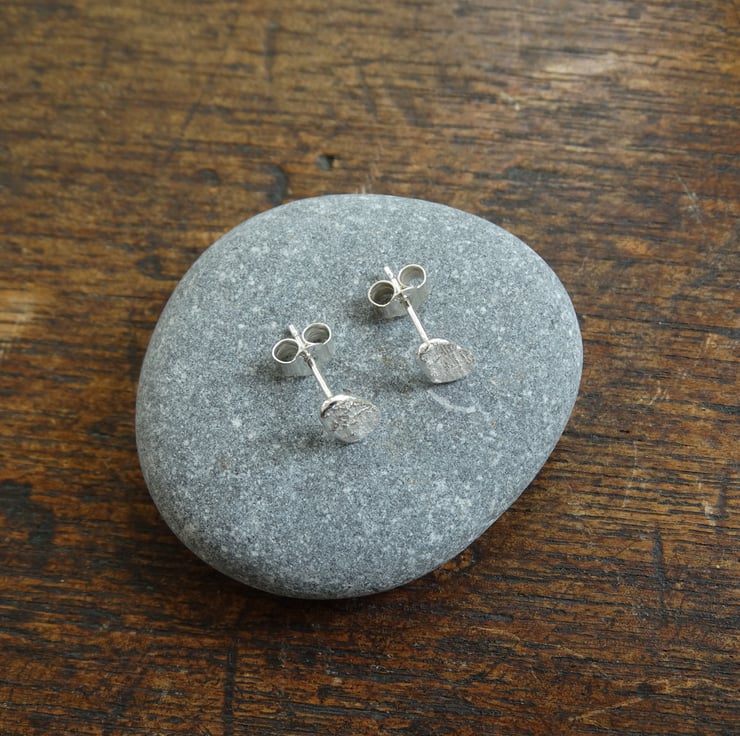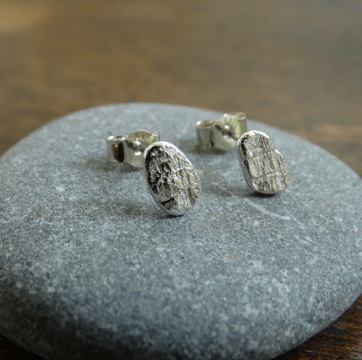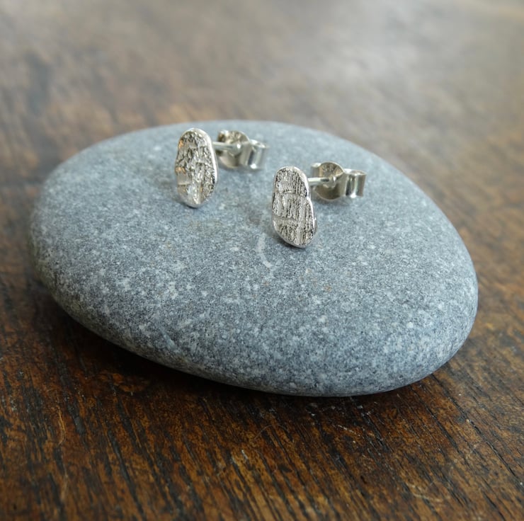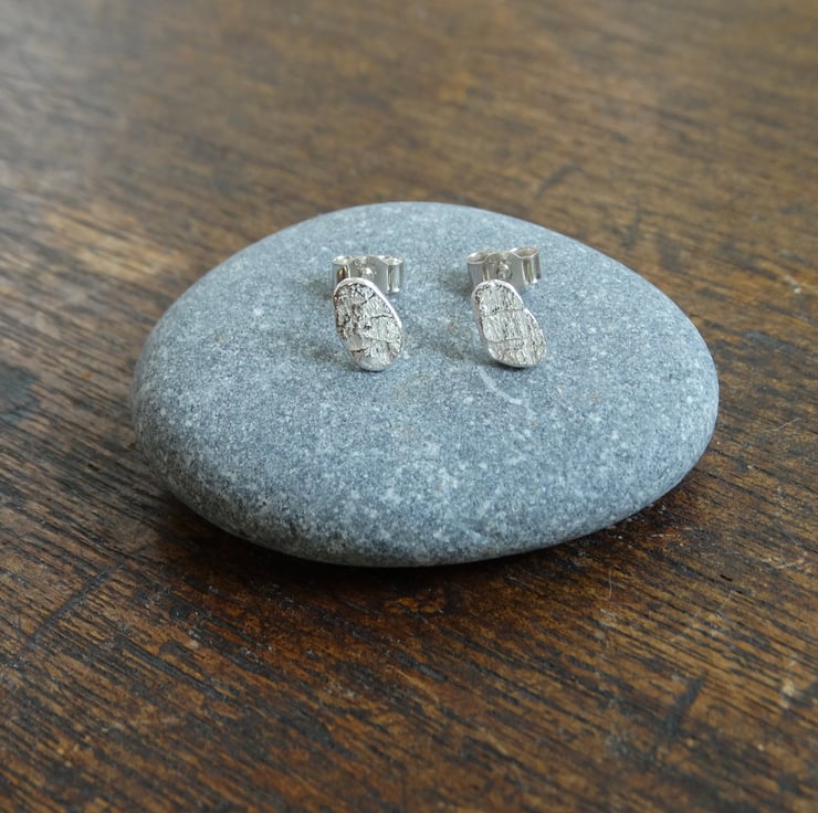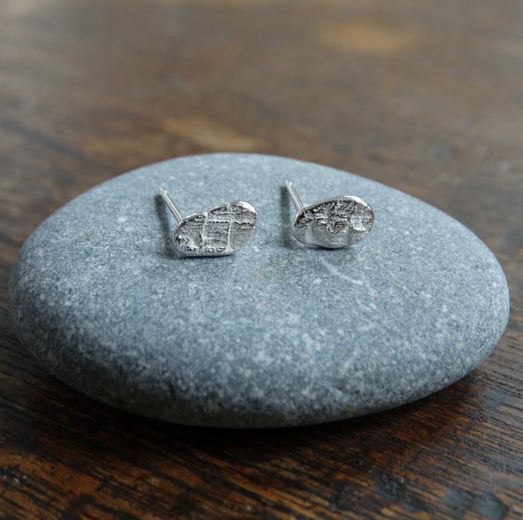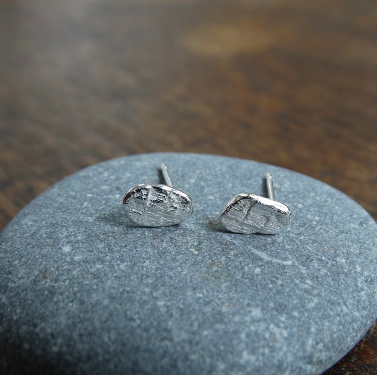These little pebble shaped stud earrings are formed by melting recycled sterling silver on to a charcoal block. The serependitous nature of molten silver means that no two earrings turn out the same. I mix and match them to create pairs, each with their own slightly mismatched and individual character.