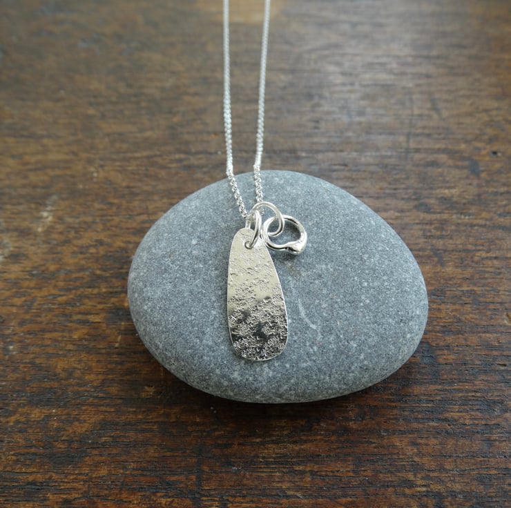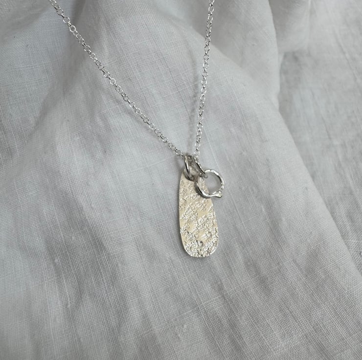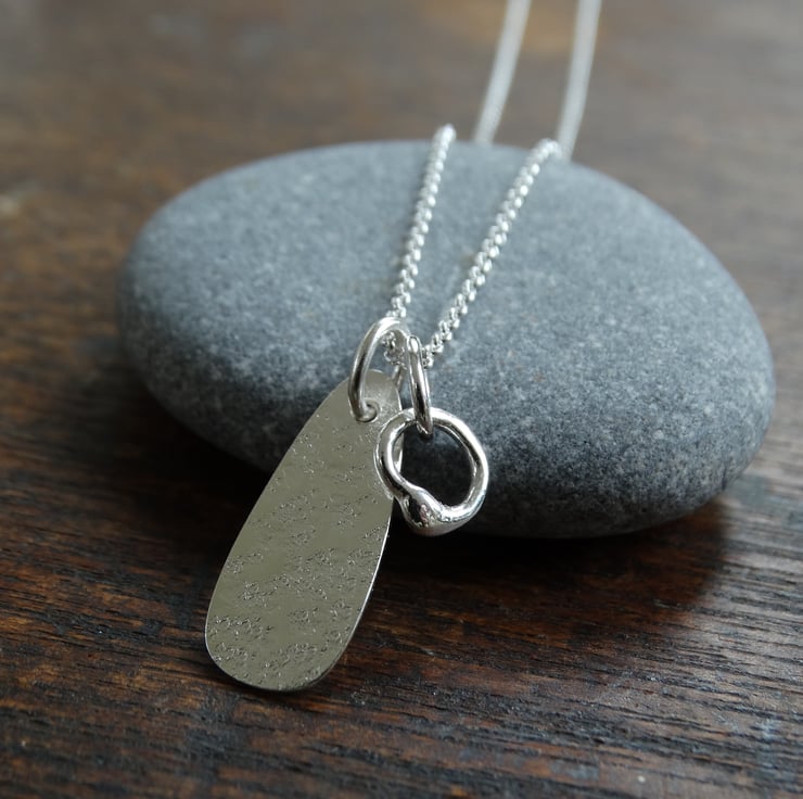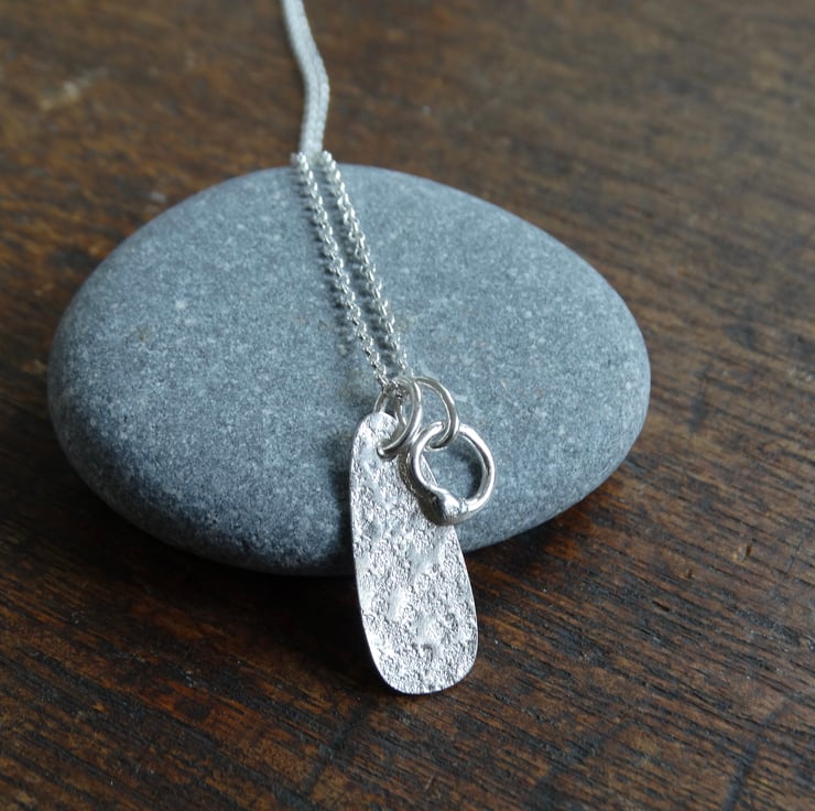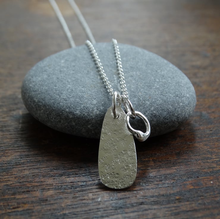 Encapsulating the idea of an amulet or charm, this pendant features an organic-shaped silver tag and a tiny molten silver ring. Both have been carefully crafted from 100% recycled sterling silver using traditional silversmithing techniques.