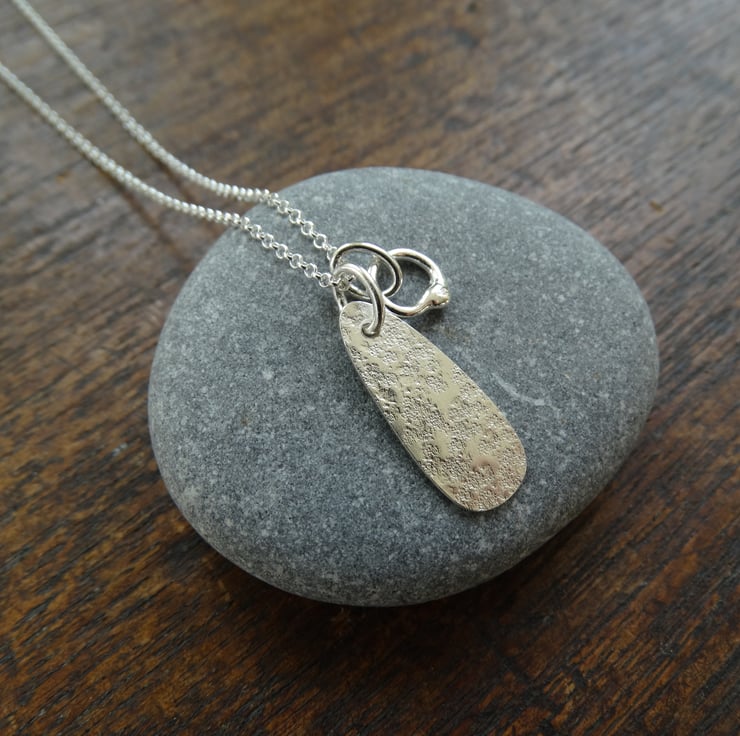 The tag has been textured all over, then polished with a brass brush to give the silver a gentle glow rather than a bright shine.