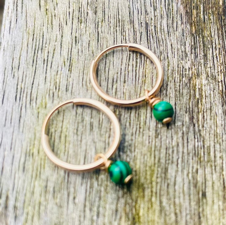 9ct gold 13mm, hallmarked hoop thin earrings, 1mm sleeper style. With grade A malachite gemstone drops, 3mm in size. A very unusual gemstone. Free gift box tied with ribbon.