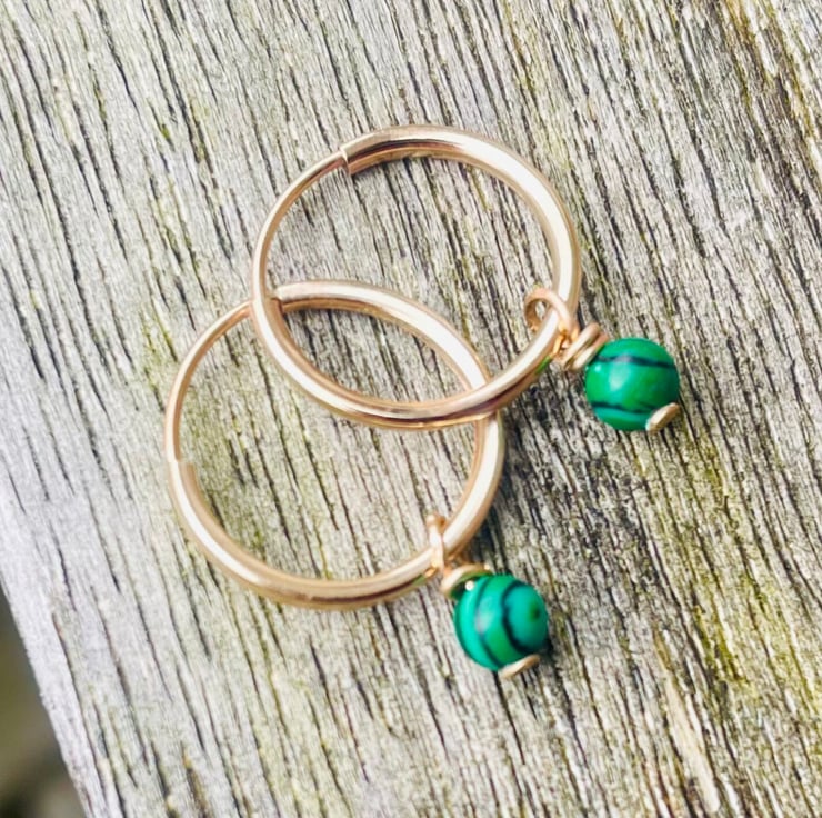 A stunning combination of 9ct gold hoop earrings with a striking green gemstone, malachite,
