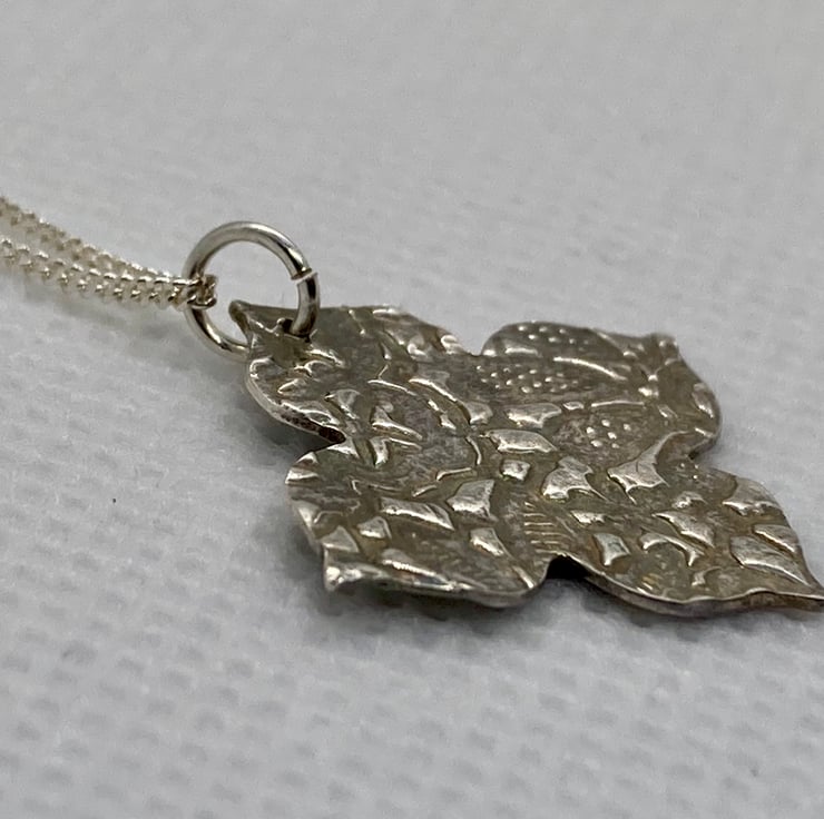 Pure silver necklace with an unusual lace texture. On an 18” sterling silver chain with an adjuster at 16”.