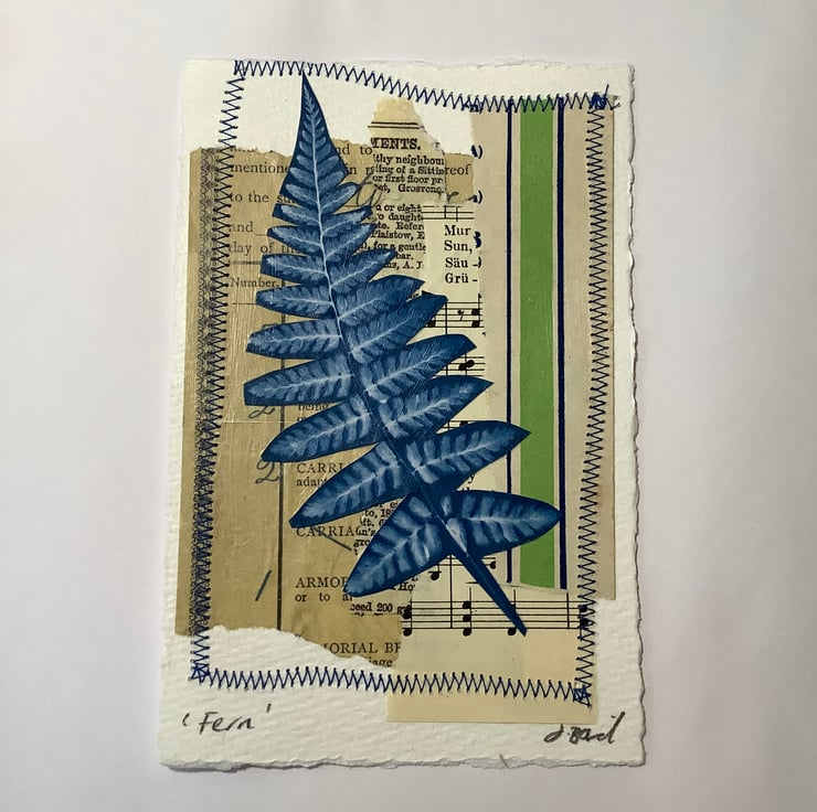 This little mixed media piece measures 4x6 inches . It has been made using a cyanotype and various little bits of vintage paper. It has also been stitched.