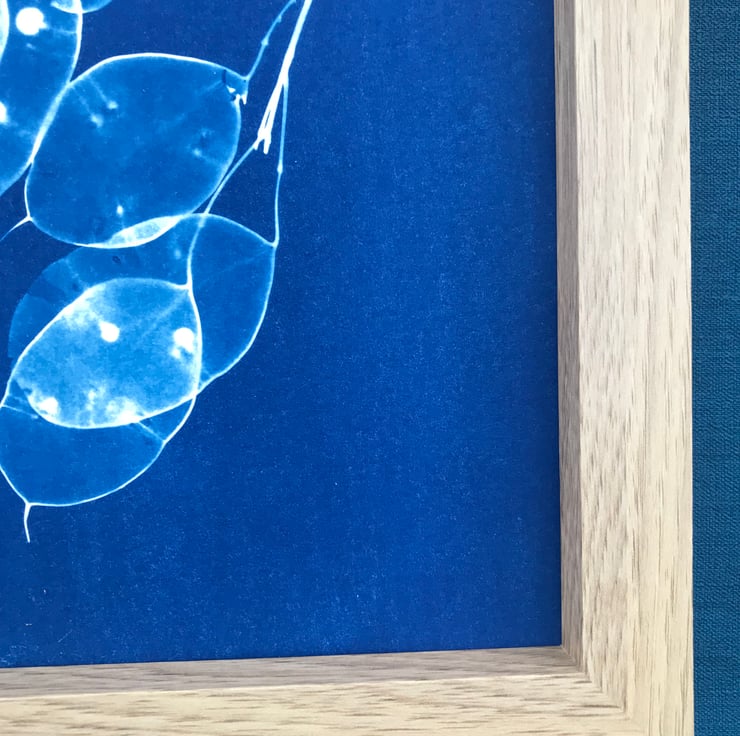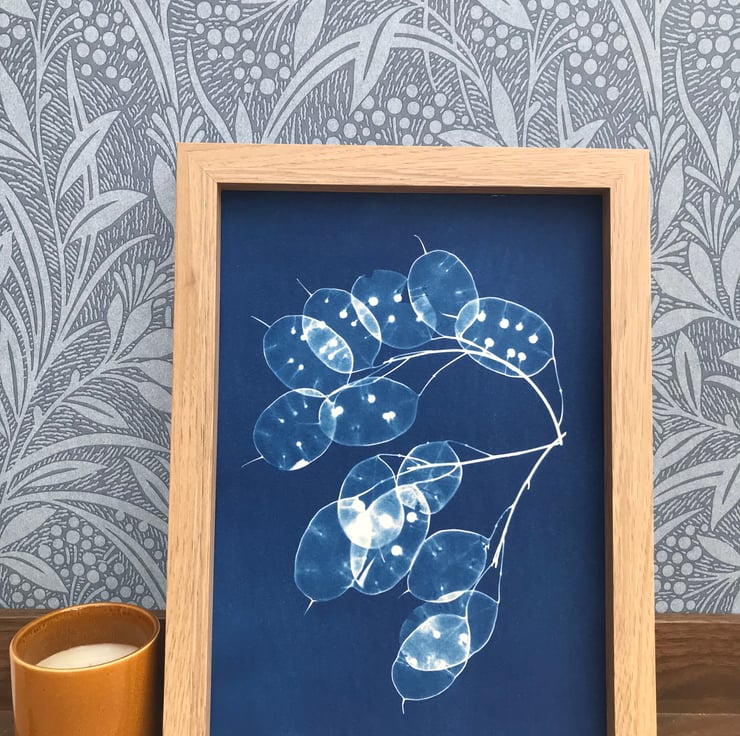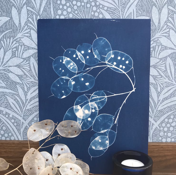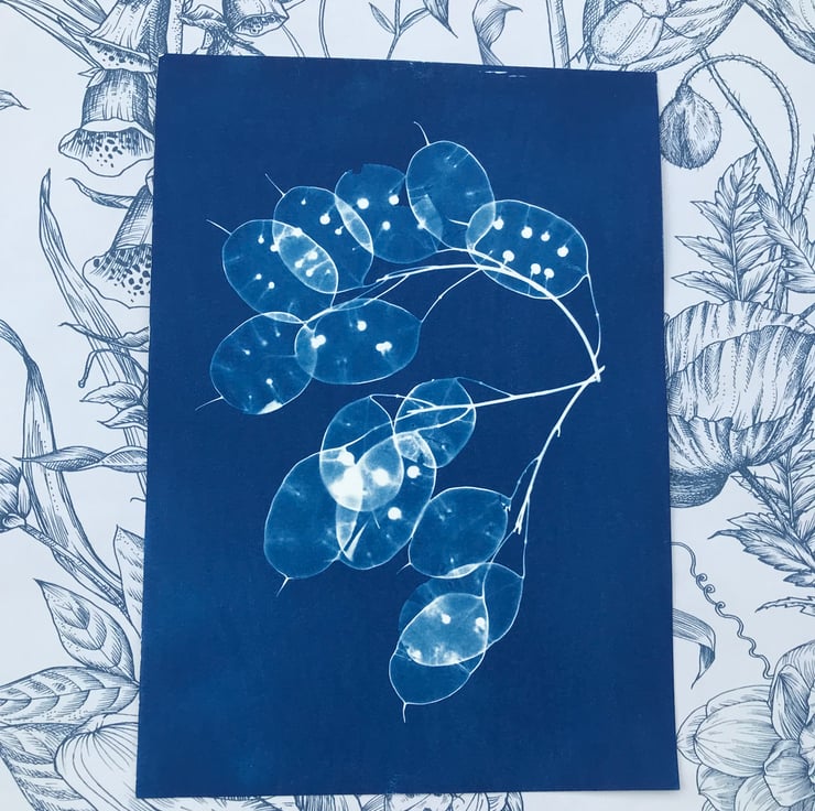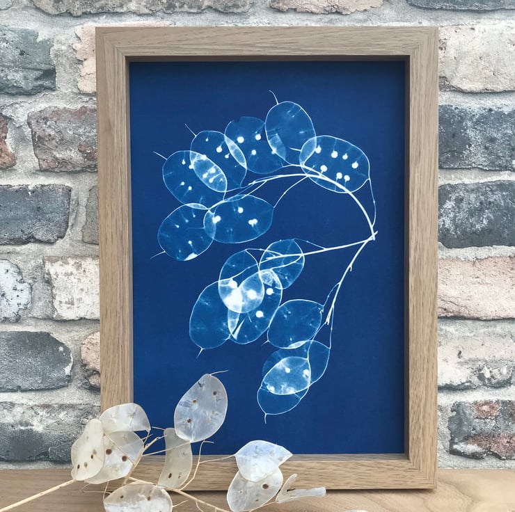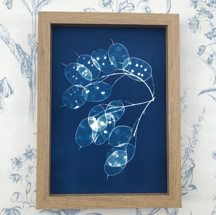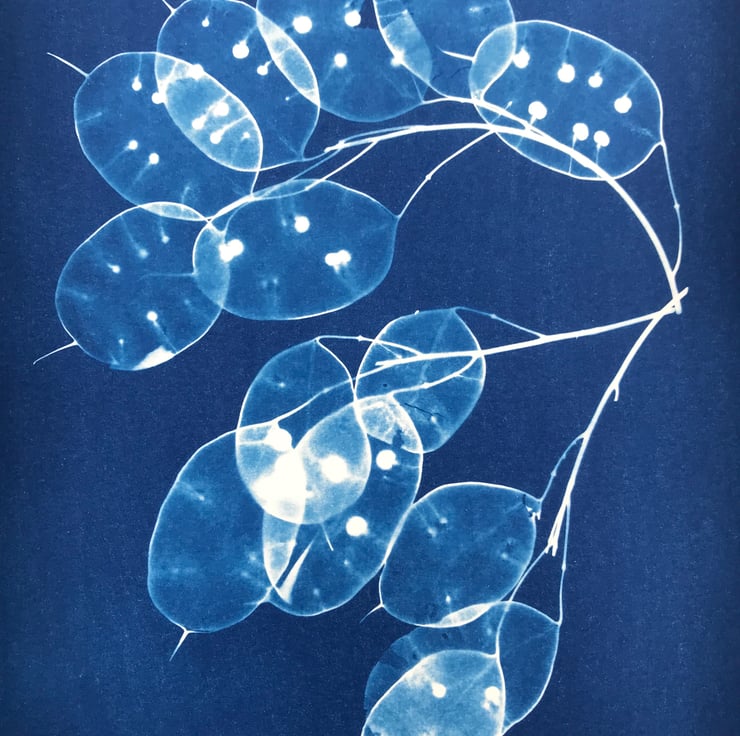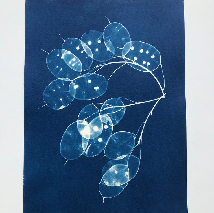 Original art in classic Prussian Blue and White, this Cyanotype Photogram is of Lunaria (Honesty) seed pods. Its Latin name, Lunaria, is derived from Luna, meaning the moon, possibly referring to the oval seed capsules which have a silvery sheen. Its common plant name 'Honesty' may come from the fact you can see the seeds through the translucent seed capsules, -no hiding place there.