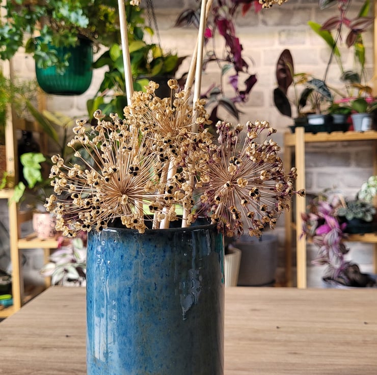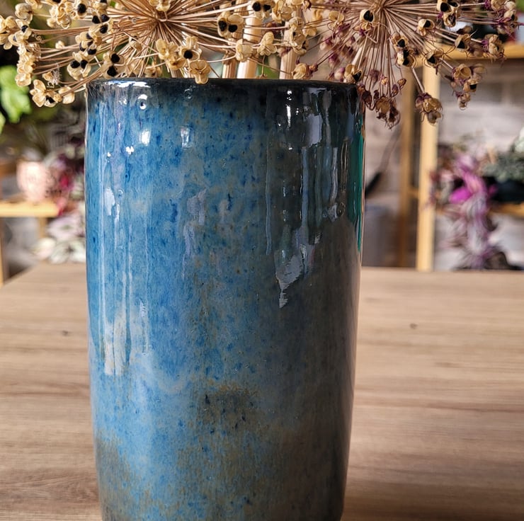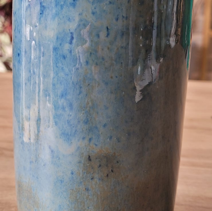 This wheel thrown vase has a blue coloured glaze on both it's inner and outer surfaces. The glaze has green and speckled variations within it This piece has a diameter of 8.5cm and a height of 15.5cm.