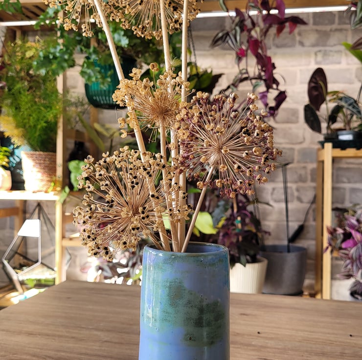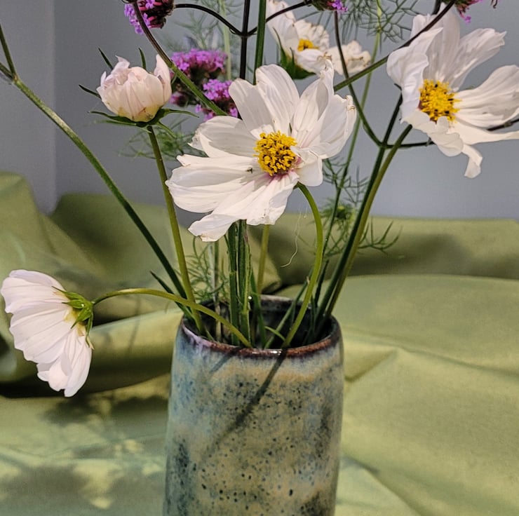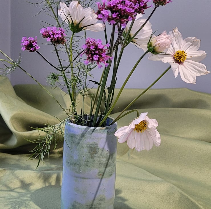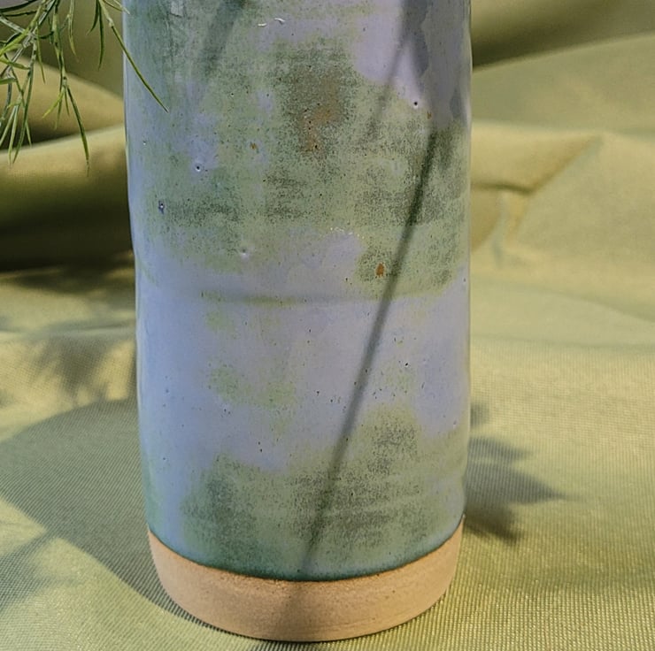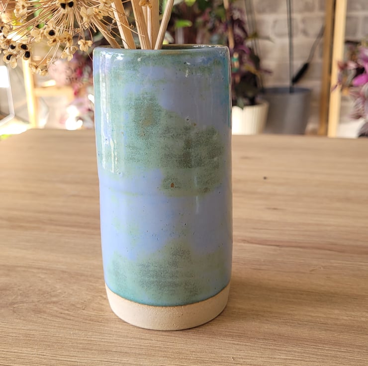 This wheel thrown cylinder vase has a sky blue and green shiny glaze covering both it's inner and outer surfaces. This piece has a diameter of 6cm and a height of 13cm.