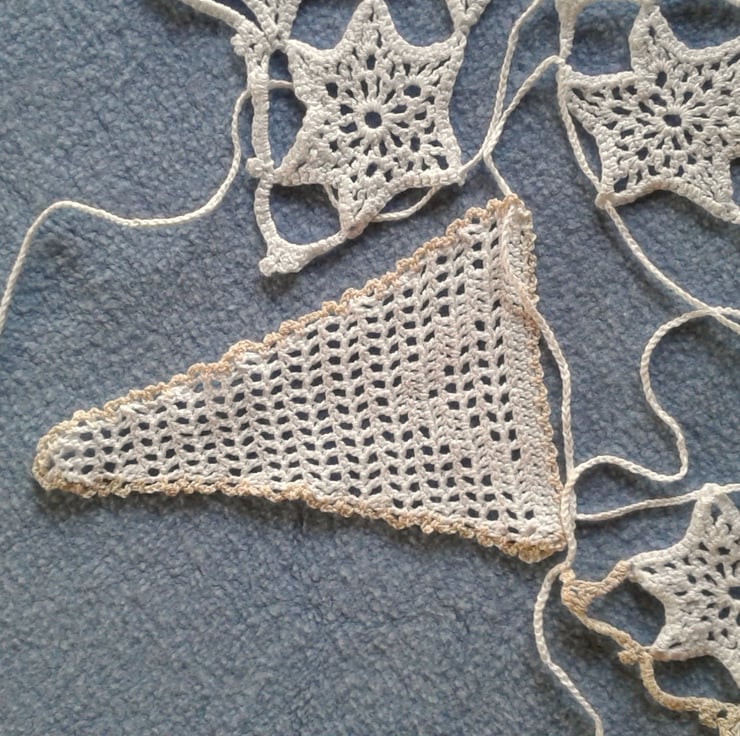 Bunting, hand crocheted lace from a vintage pattern with Filet and stars motifs.