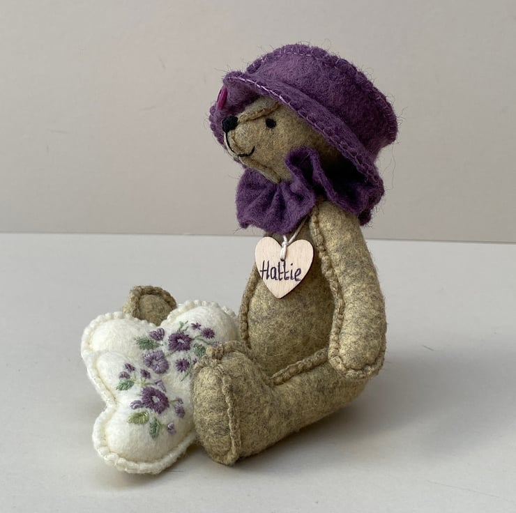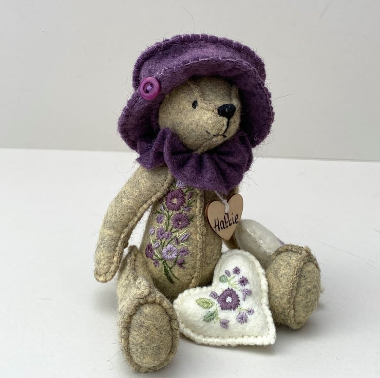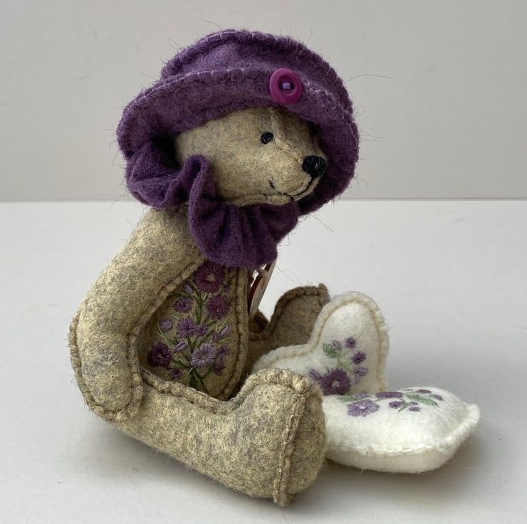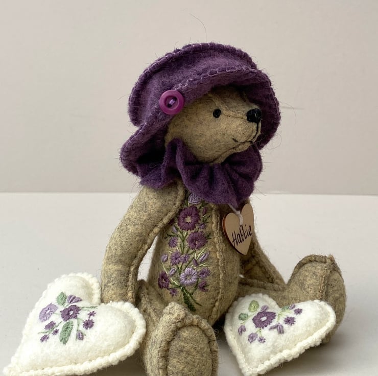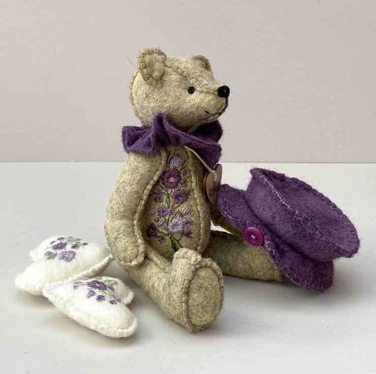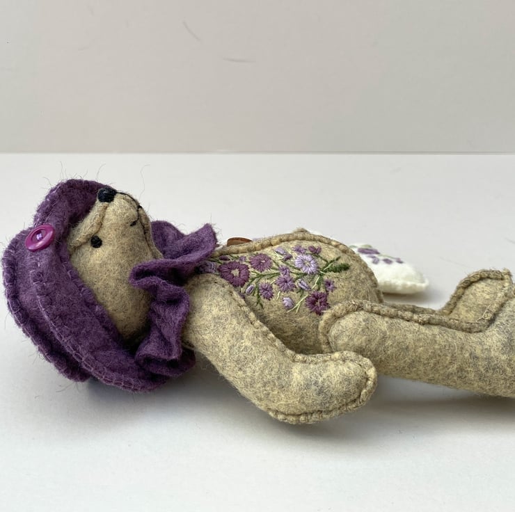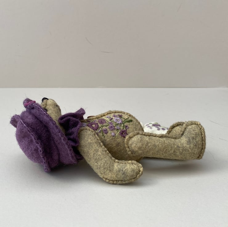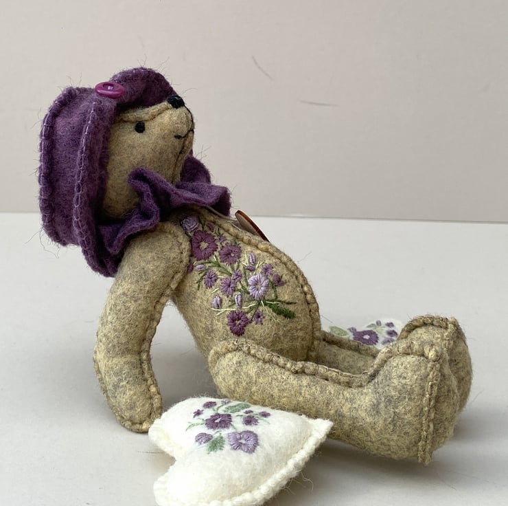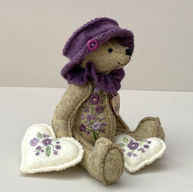 Signature bear in straw marl, a slightly smaller, slimmer version with hand embroidery in various purples to one side of her body.