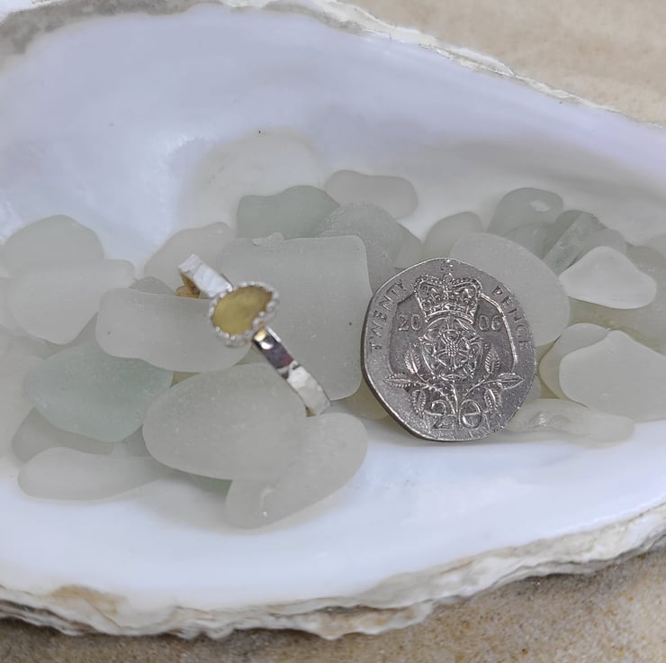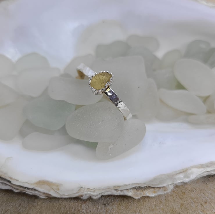 A piece of genuine UK sea glass (light yellow gold) set in fine silver on a sterling silver hammered band.