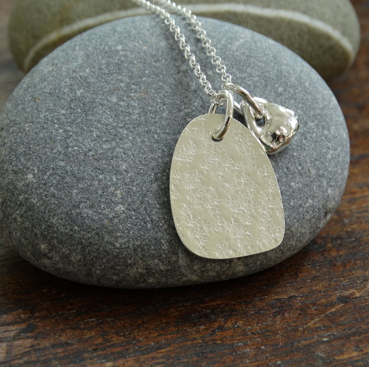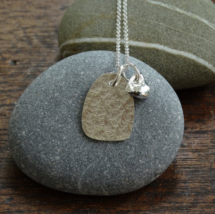 Inspired by ideas of jewellery that is worn as a charm or amulet, this mathom pendant features an organic-shaped silver tag and a tiny molten silver hagstone or pebble. Both have been carefully crafted from 100% recycled sterling silver using traditional silversmithing techniques.