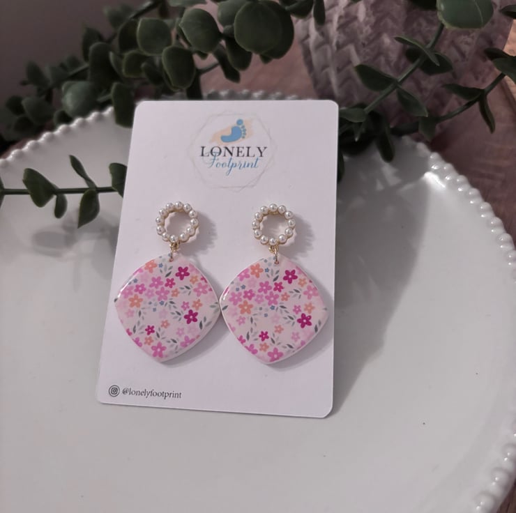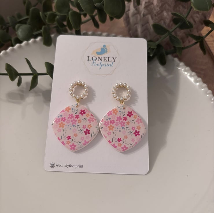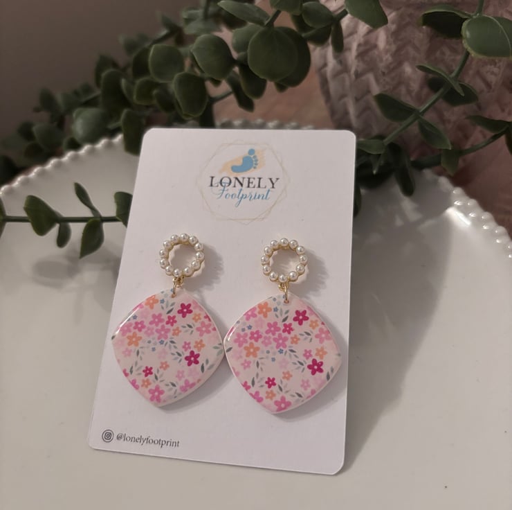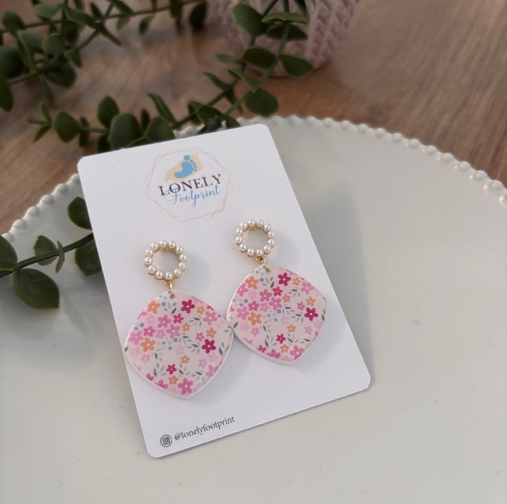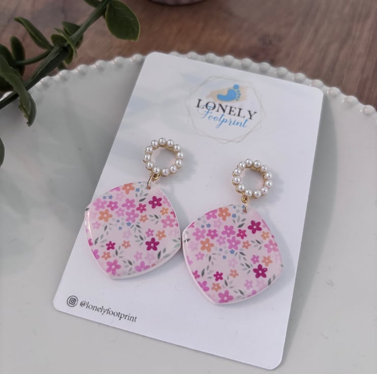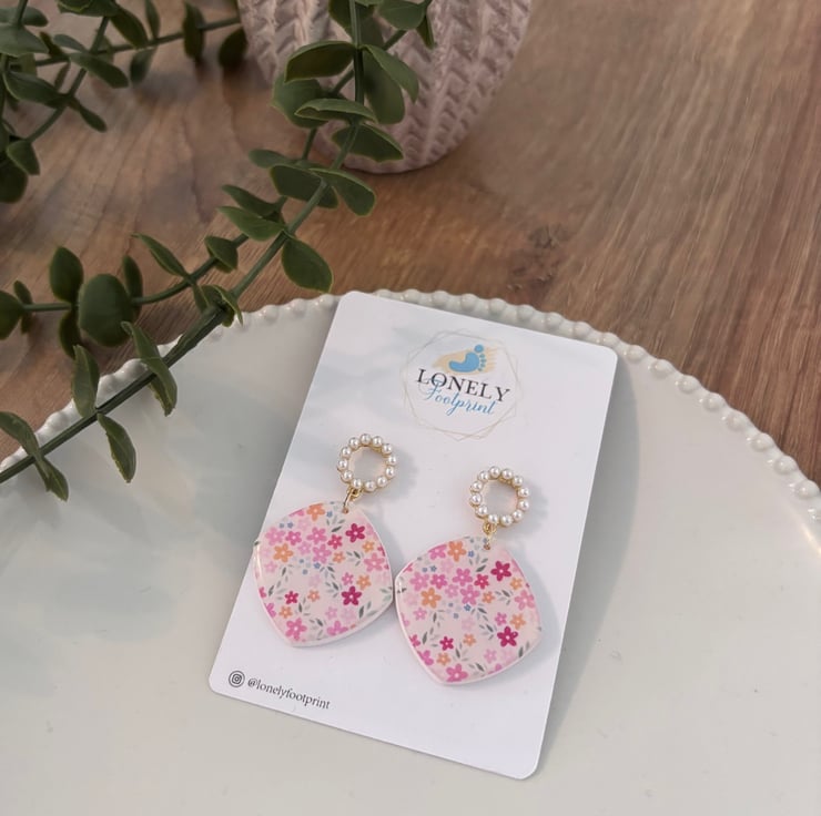 Elegant and feminine, these handmade dangle earrings feature a floral pattern paired with faux pearl studs. Perfect for spring, summer, weddings, or as a thoughtful gift for someone special.