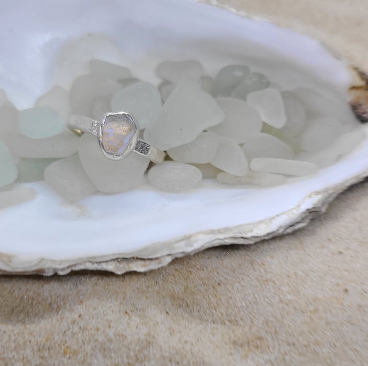 A piece of genuine UK sea glass (iridescent white) set in fine silver on a sterling silver hammered band.