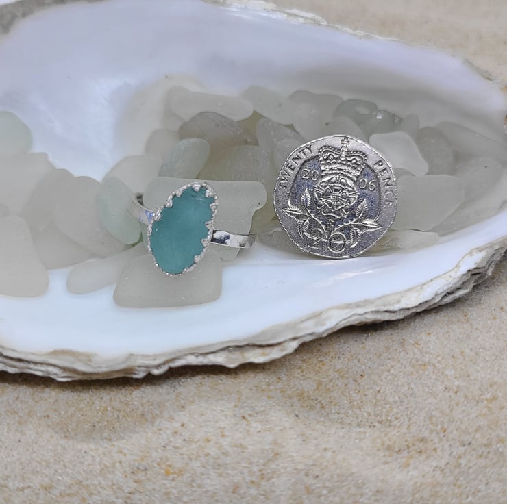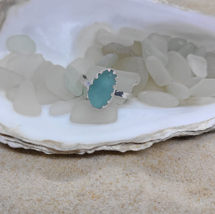 A piece of genuine UK sea glass (light teal blue) set in fine silver on a sterling silver hammered band.