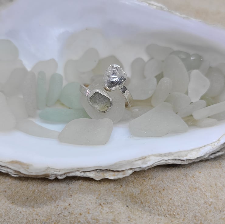 A piece of genuine UK sea glass (pale olive green) set in fine silver on a sterling silver hammered band with a fine silver cockle..
