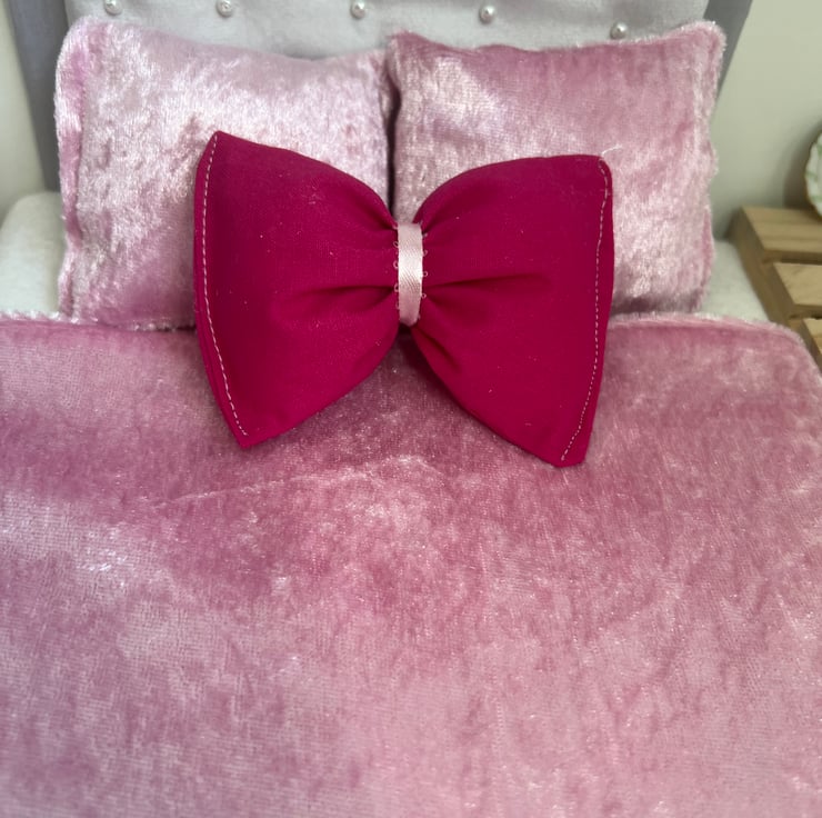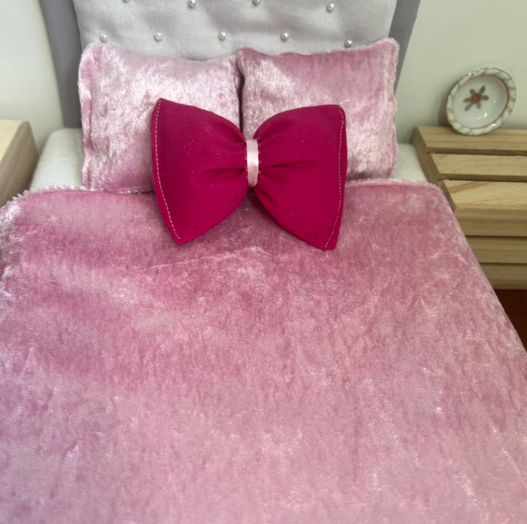 These are made to 1/6 scale for a double bed. You will receive the duvet cover, two scatter cushions and one bolster pillow. The bed and the doll are not included in the price. All fillings are made with flame retardant wadding. All cover fabrics are only made using materials that have been signed off as having OTEX standard ratings. Keep away from extreme heat.