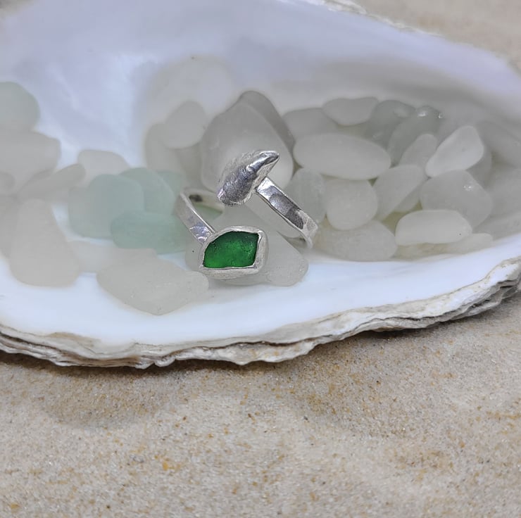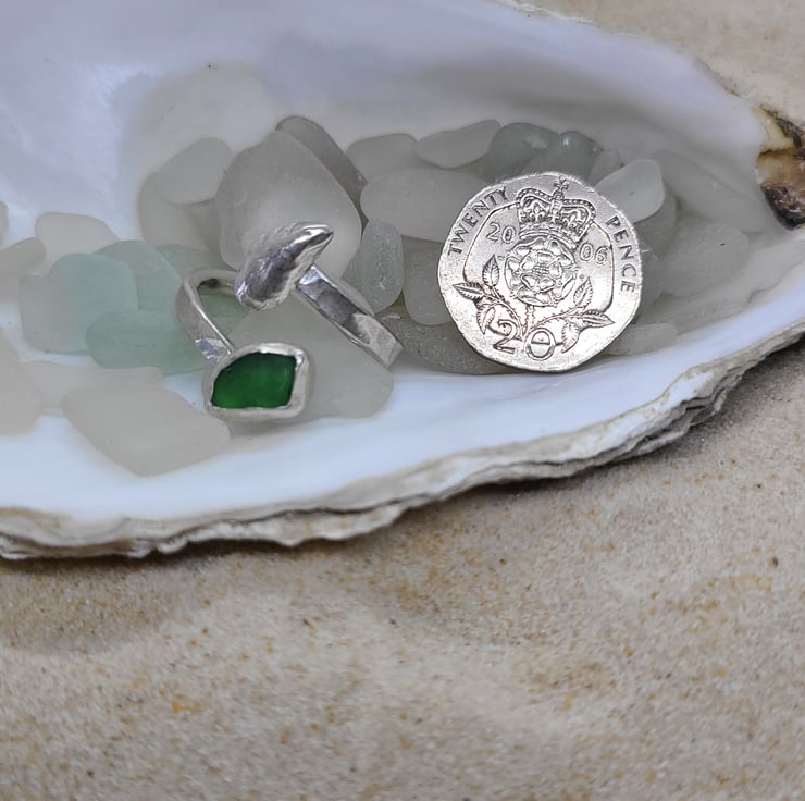 A piece of genuine UK sea glass (kelly green) set in fine silver on a sterling silver hammered band with a fine silver mussel.