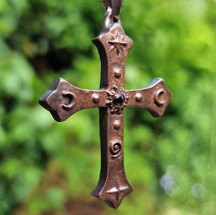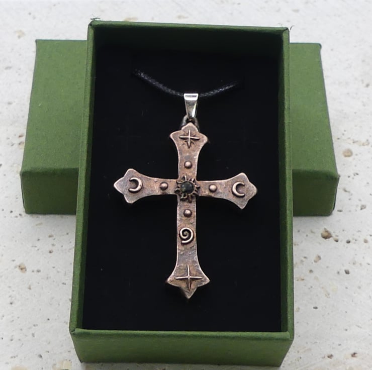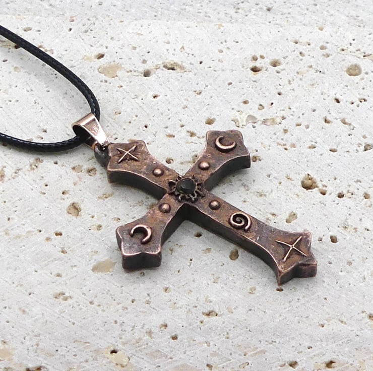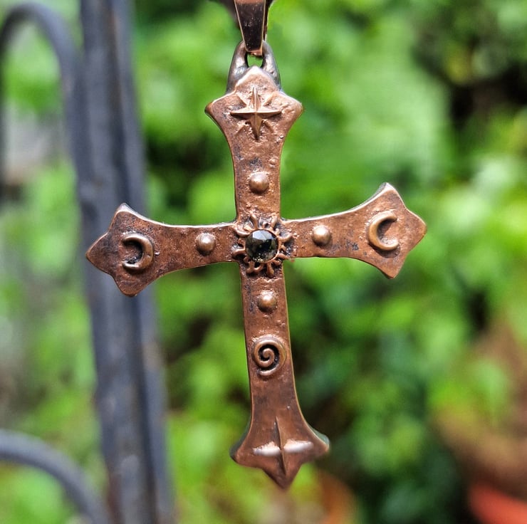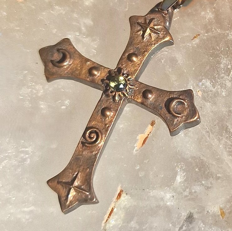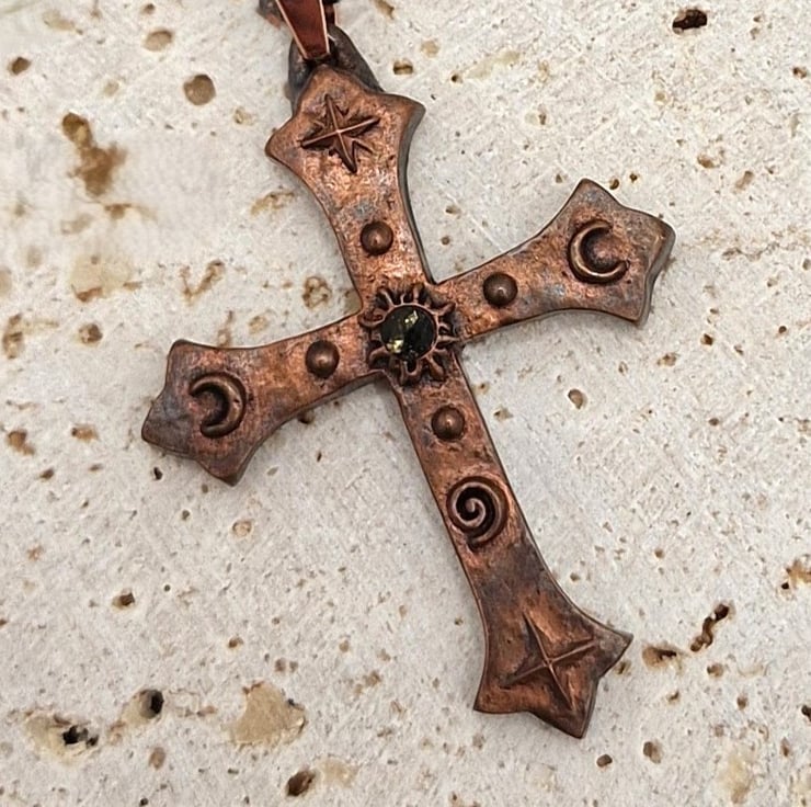 Large Copper Cross Pendant, Sun, Moons, Stars, Spiral with Citrine Gem Necklace.