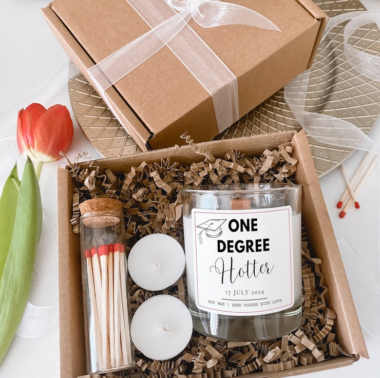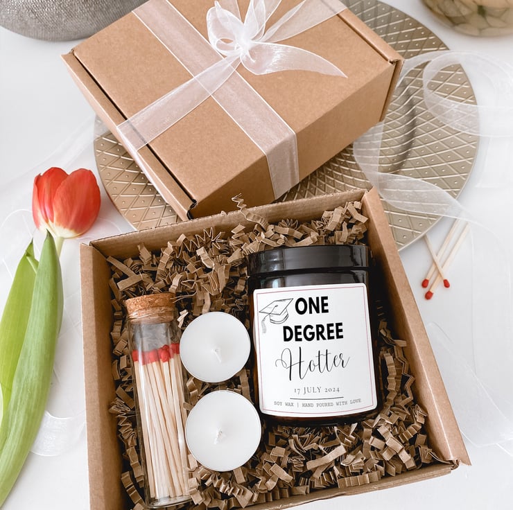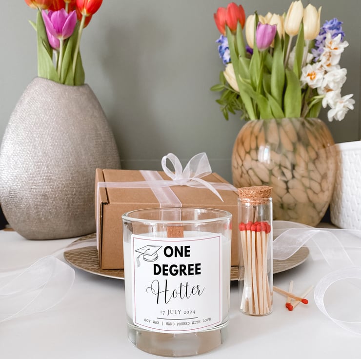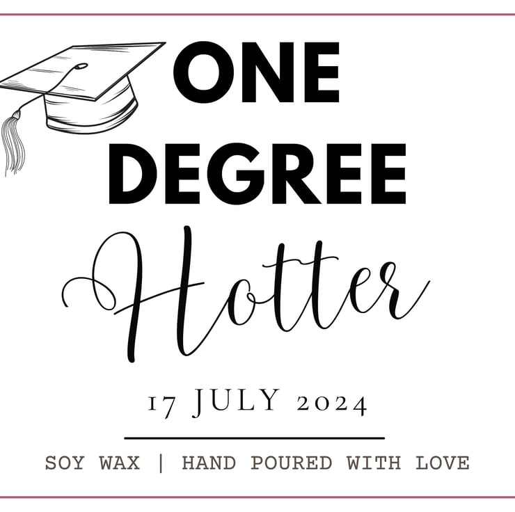 One Degree Hotter the ultimate Graduation Gift that's both meaningful and fun! Celebrate this milestone with a Funny Graduation Gift for Him or Her. Perfect for a University Leaving Gift, Graduation Gift for your Son or Daughter, or a School Leaving Gift, this Custom Graduation scented candle is sure to delight.