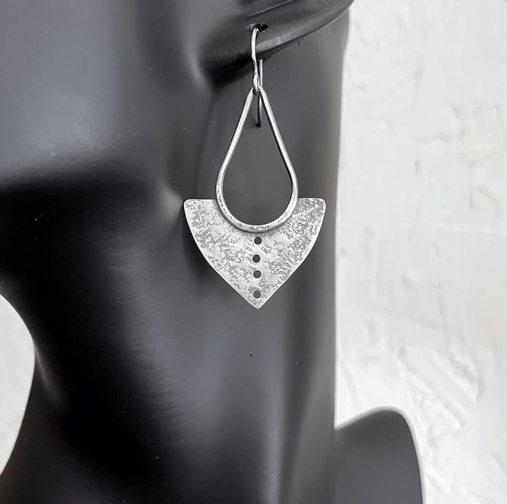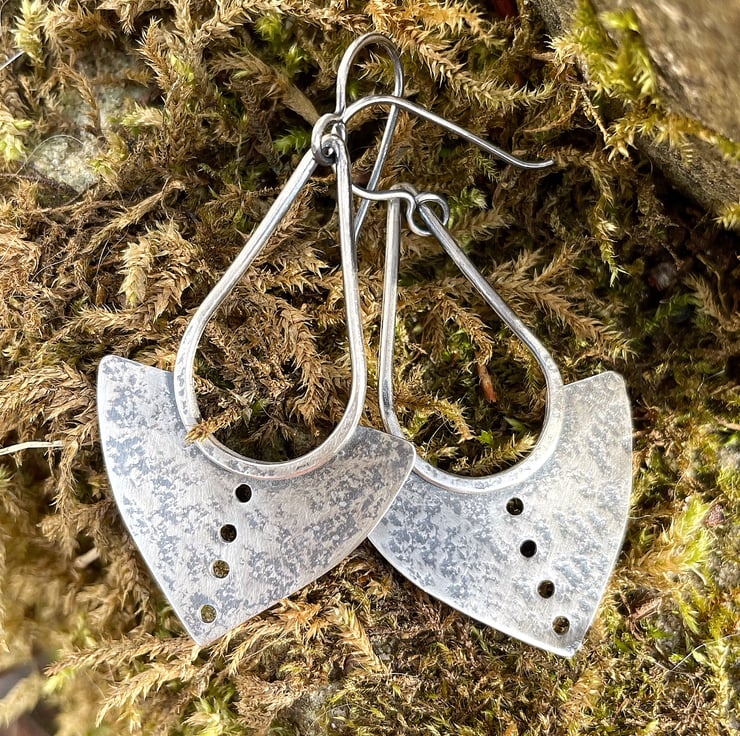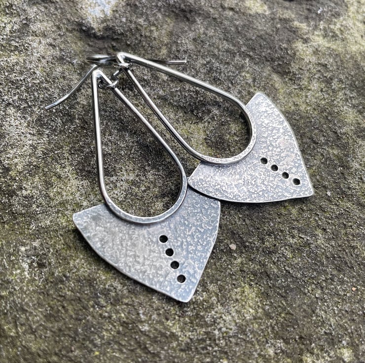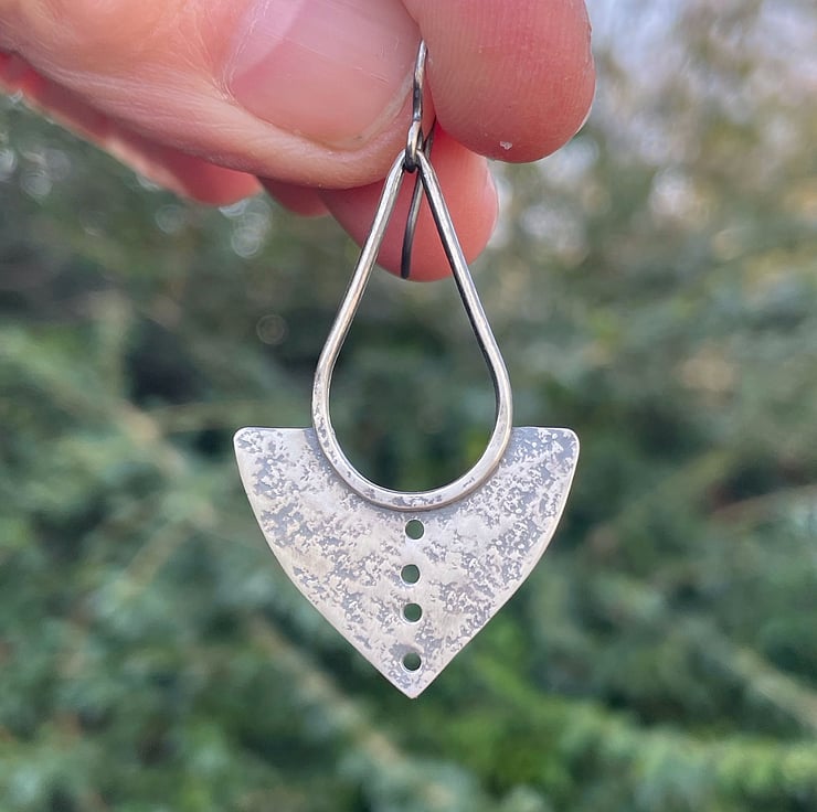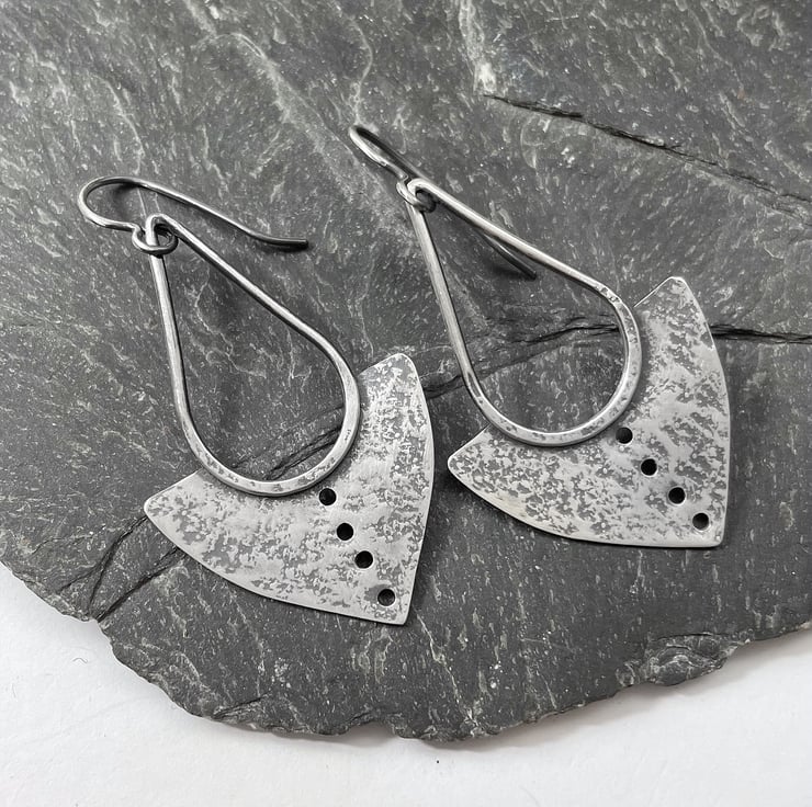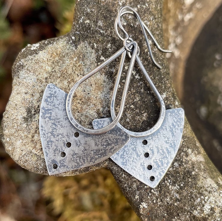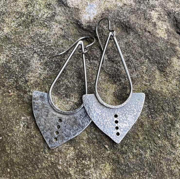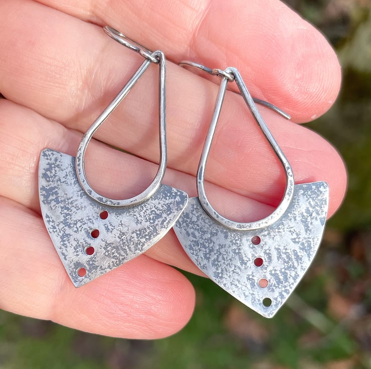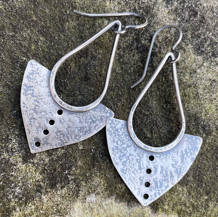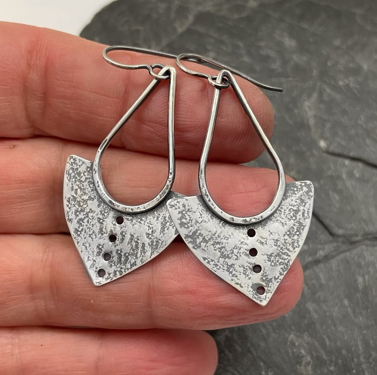 Shield shapes sit below tear drop loops, and hang from hook ear-wires. The earrings have 4 central cutouts adding depth and detail.