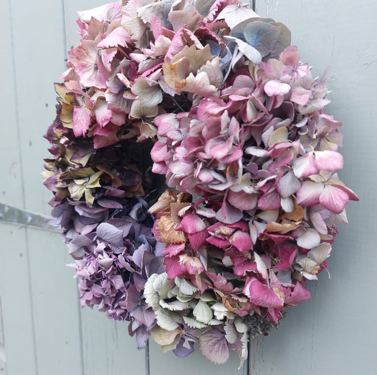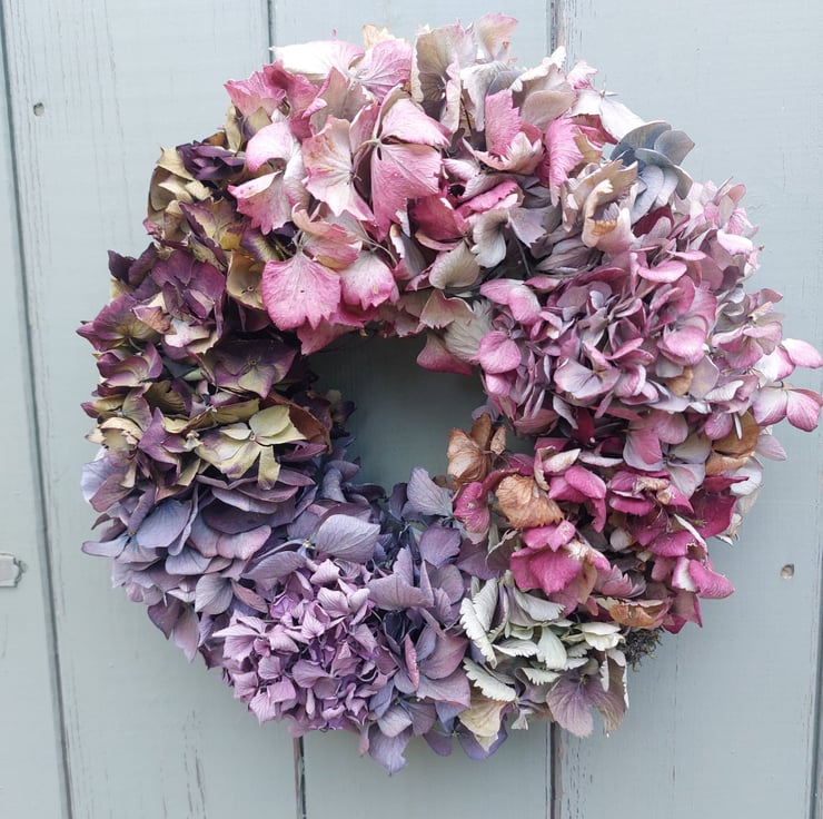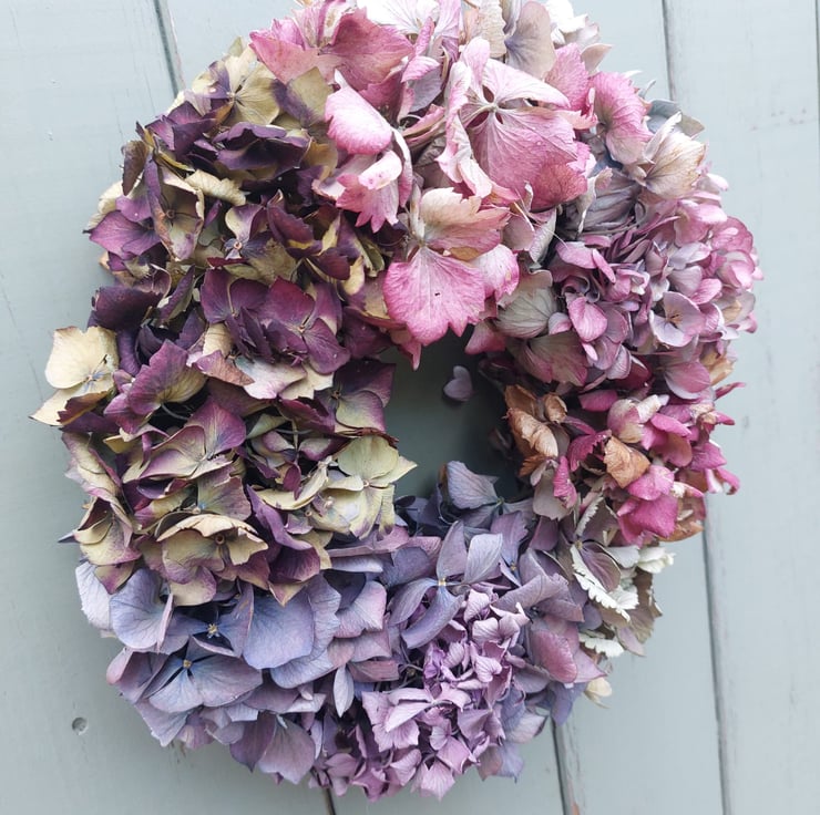 A handmade dried hydrangea wreath measuring approximately 26cm in diameter in shades of purple.