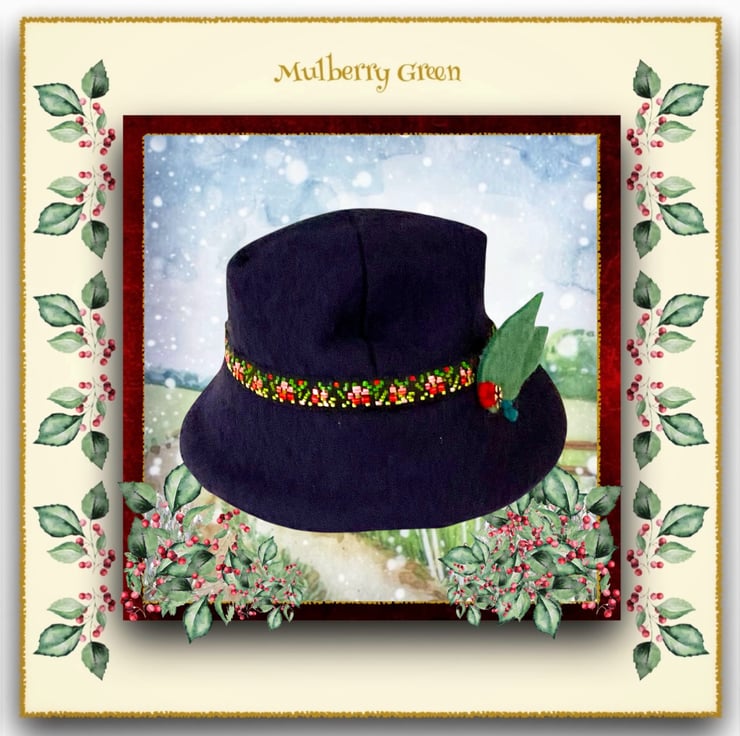 A little navy blue felt hat, decorated with a woven braid, felt leaves and sequins, to fit the Mulberry Green dolls.