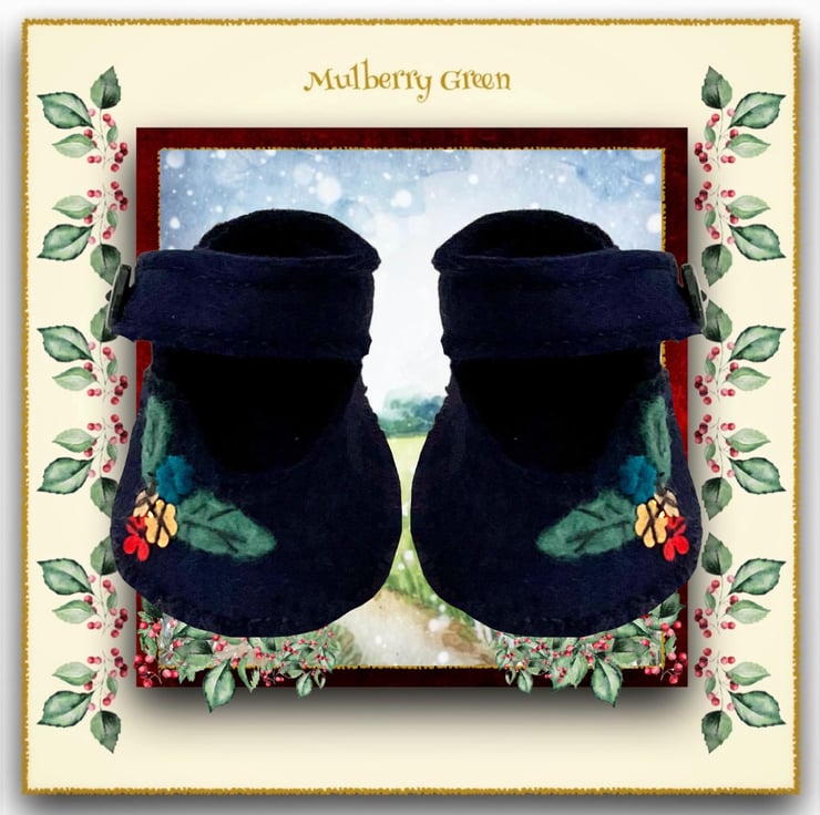 A cute little pair of navy felt shoes, decorated with felt leaves and sequins, to fit the Mulberry Green dolls.