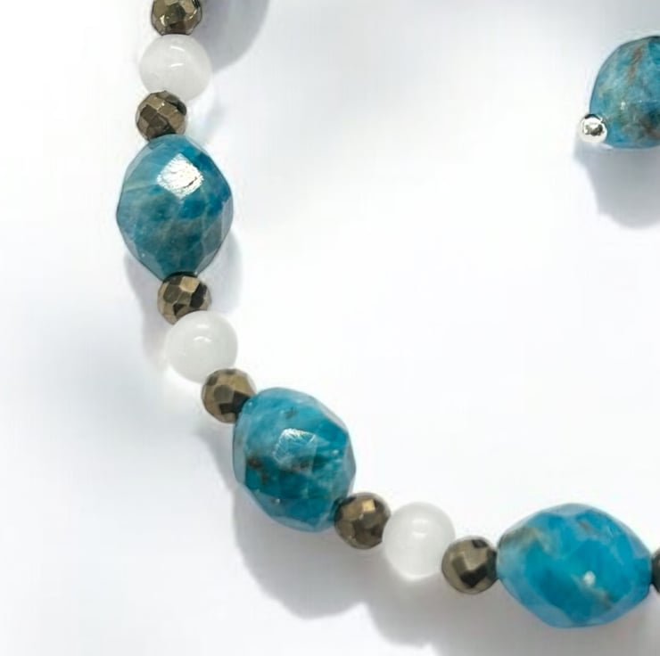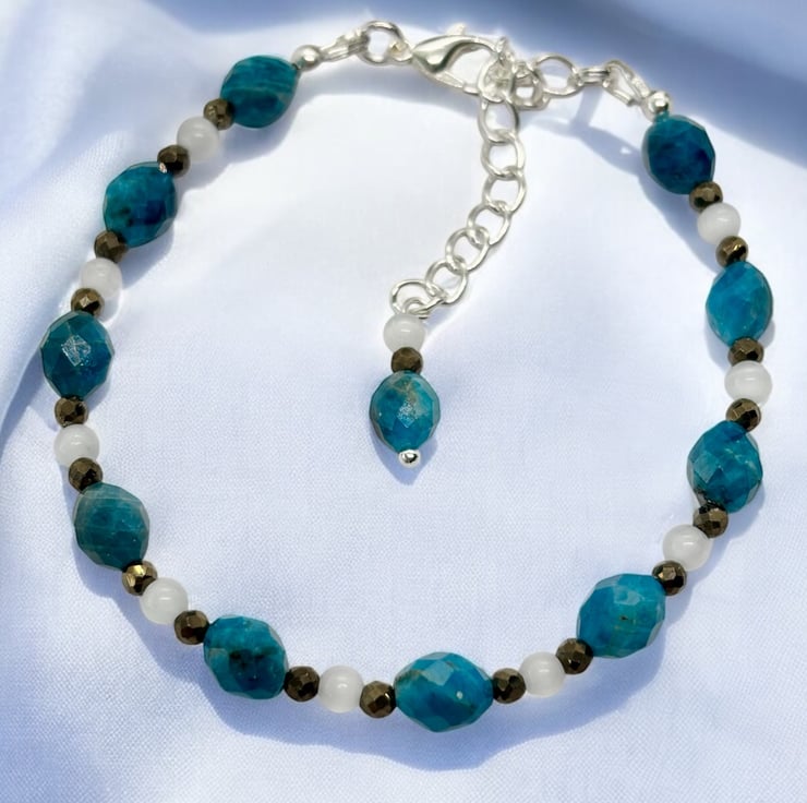 stunning handmade bracelet, featuring vibrant 7x5mm faceted neon blue Apatite beads that catch the light beautifully. Accented with shimmering 3mm Pyrite (fool's gold) faceted beads and soothing 4mm natural selenite round beads, this piece is not just a bracelet but a statement of elegance. The added extender chain and matching dangle charm ensure a perfect fit for any wrist. The bracelet will be wrapped in pretty tissue paper and presented in a lovely organza bag, making it an ideal gift. Enjoy peace of mind with standard 48-hour tracked