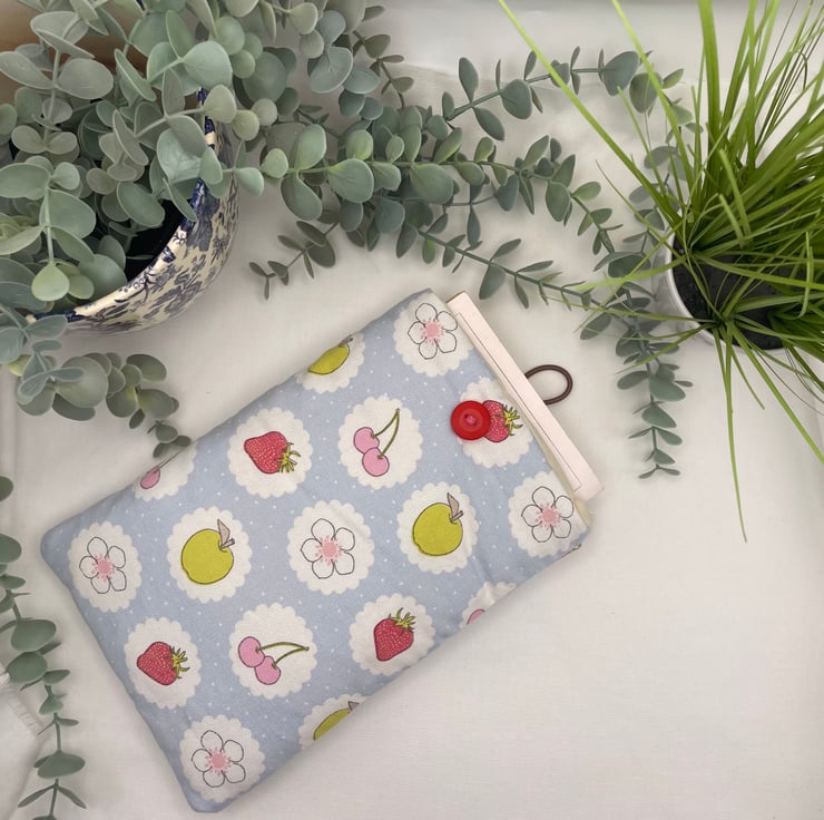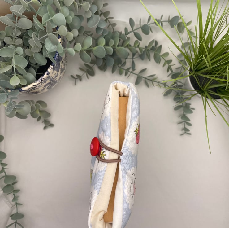 This lovely book sleeve is hand made with predominantly recycled materials. Some parts have newly sourced materials (e.g., buttons, thread and hair ties etc). It is 9-9.5 x 6 inches (approx). This has a pocket on one side for additional items such as pens, notebooks or snacks. These book sleeves are handmade from recycled materials and will hold a standard sized paperback book. These are great for travelling or just for keeping your book protected in your everyday bag.