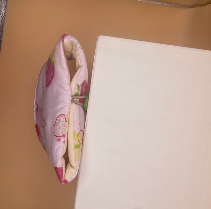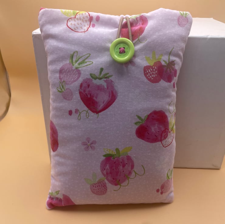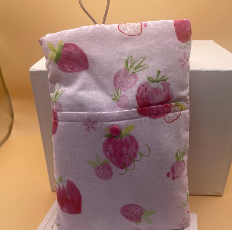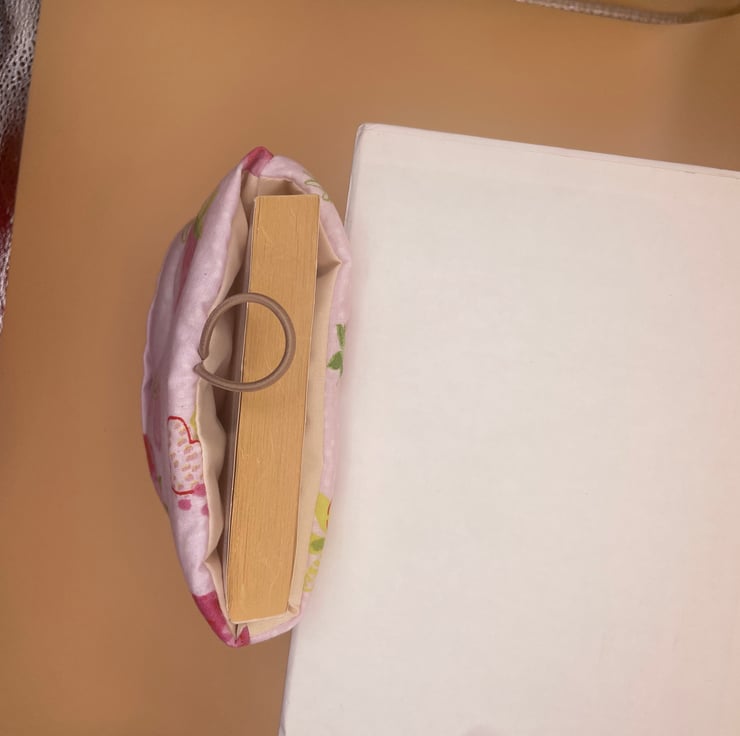 This lovely book sleeve is hand made with predominantly recycled materials. Some parts have newly sourced materials (e.g., buttons, thread and hair ties etc). It is 9-9.5 x 6 inches (approx). This has a pocket on one side for additional items such as pens, notebooks or snacks. These book sleeves are handmade from recycled materials and will hold a standard sized paperback book. They are great for travelling or just for in your bag to keep your book protected.