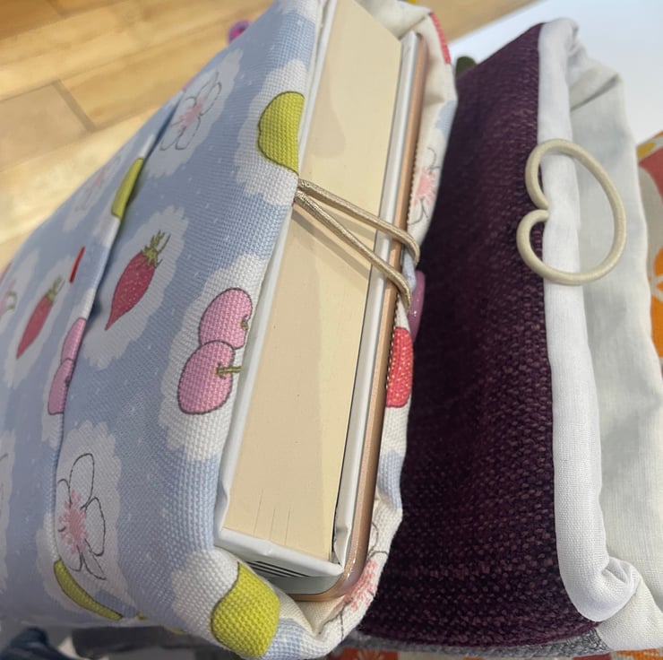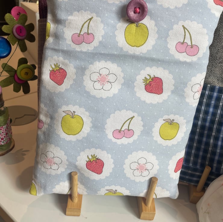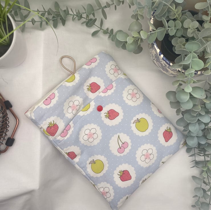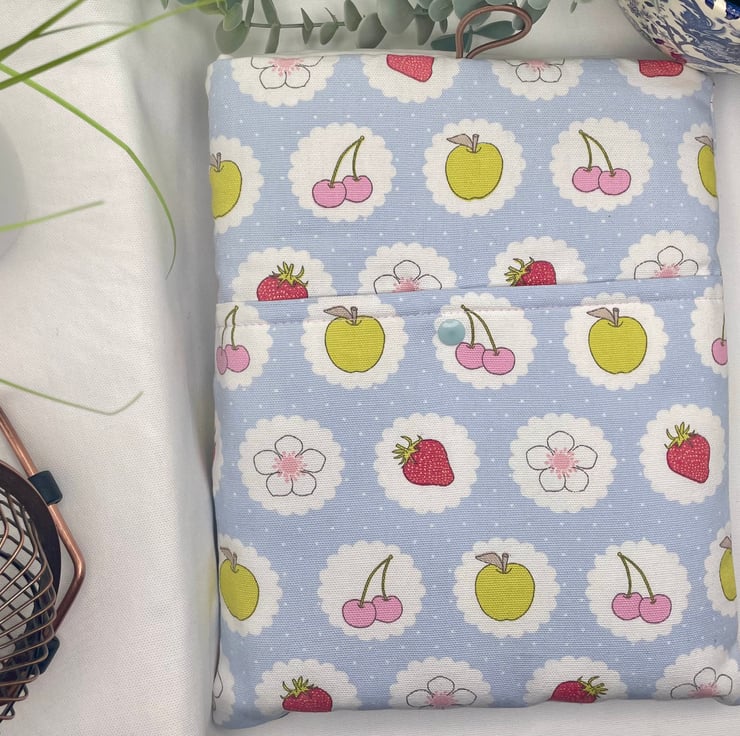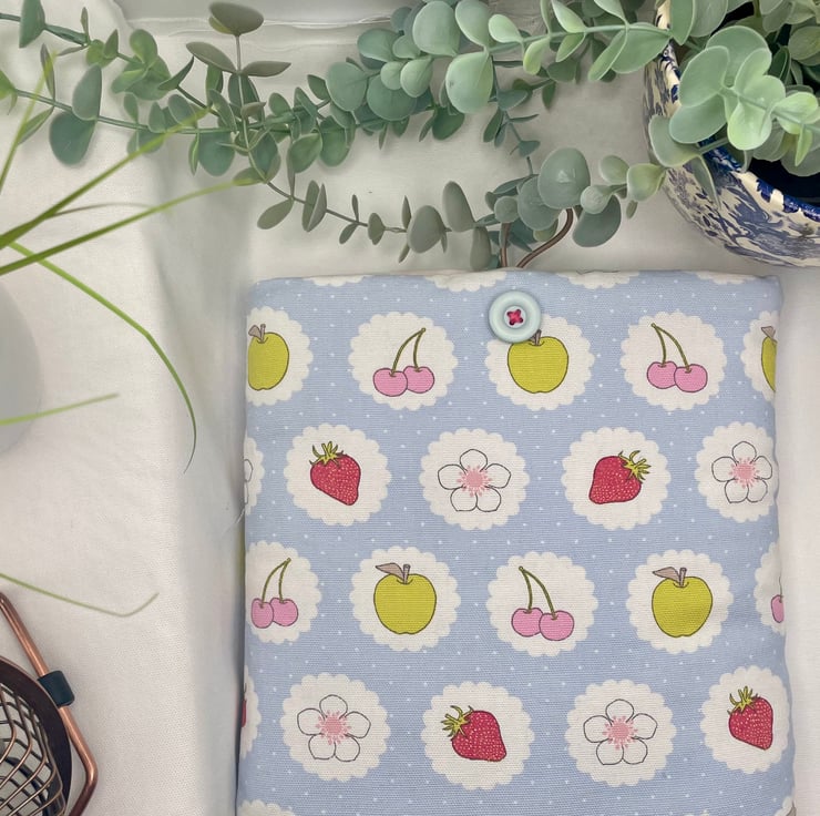 This lovely book sleeve is hand made with predominantly recycled materials. Some parts have newly sourced materials (e.g., buttons, thread and hair ties etc). It is 8 x 10 inches (approx) This has a pocket on one side for additional items such as pens, notebooks or snacks. These are so handy and such a unique quality handmade gift that really shows you care.