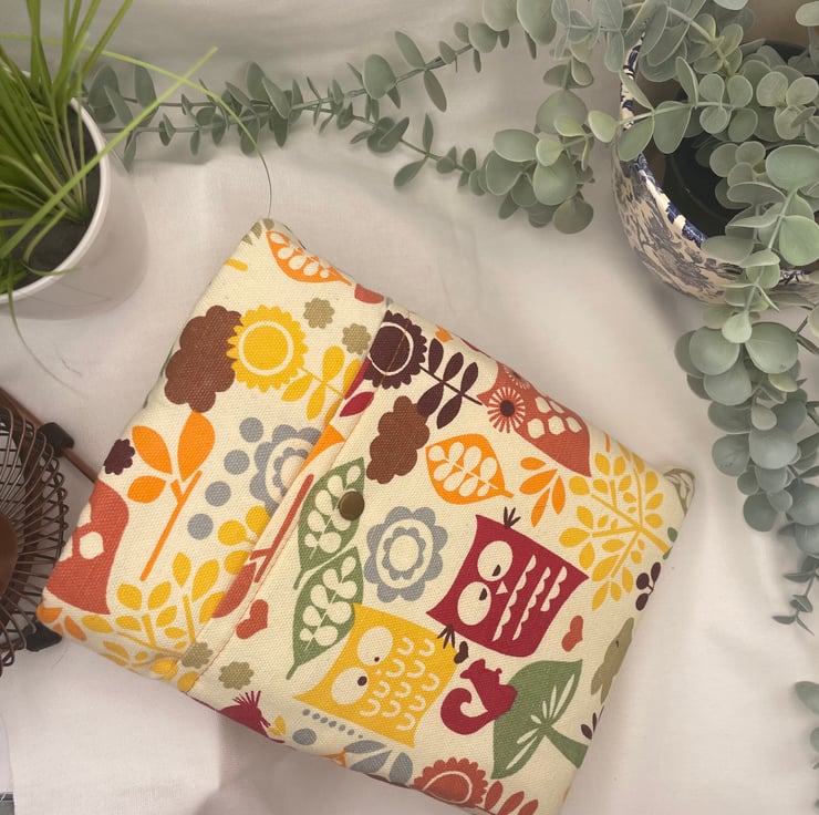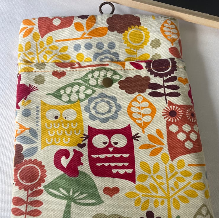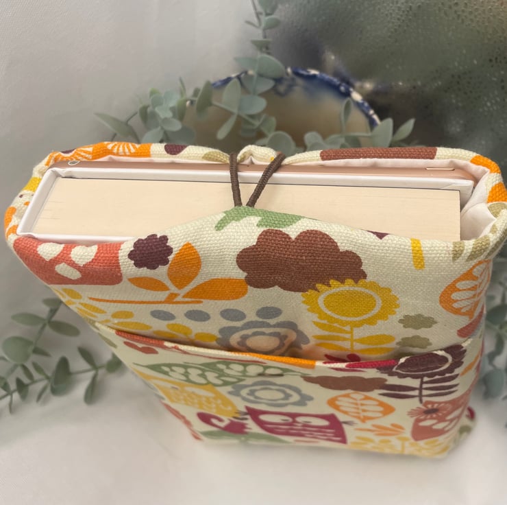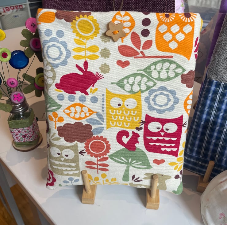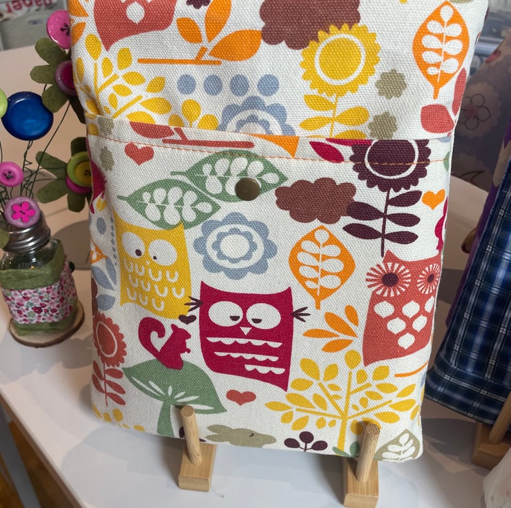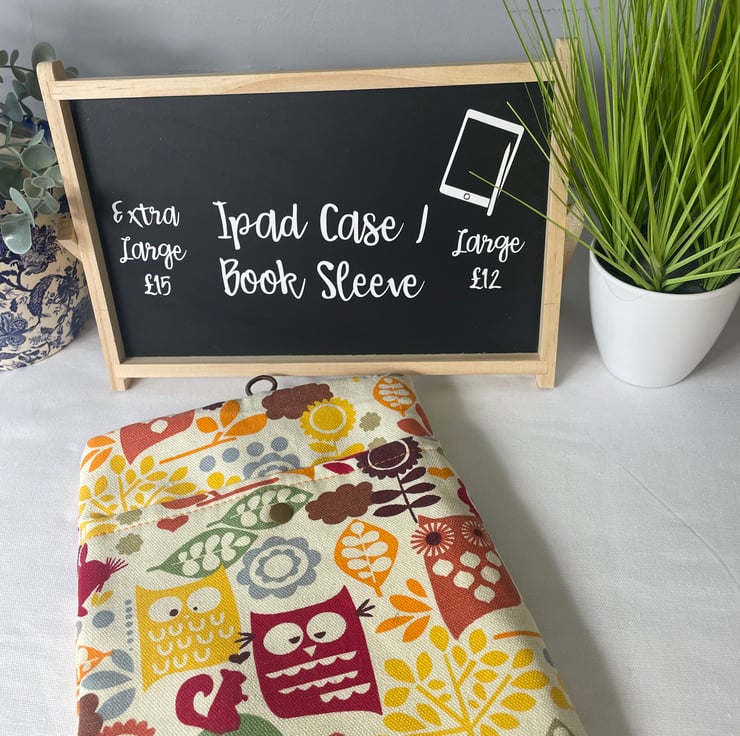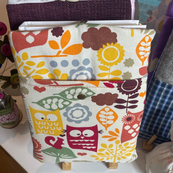 This lovely book sleeve is hand made with predominantly recycled materials. Some parts have newly sourced materials (e.g., buttons, thread and hair ties etc). It is 8 x 10 inches (approx) This has a pocket on one side for additional items such as pens, notebooks or snacks. These are so handy and such a unique quality handmade gift that really shows you care.