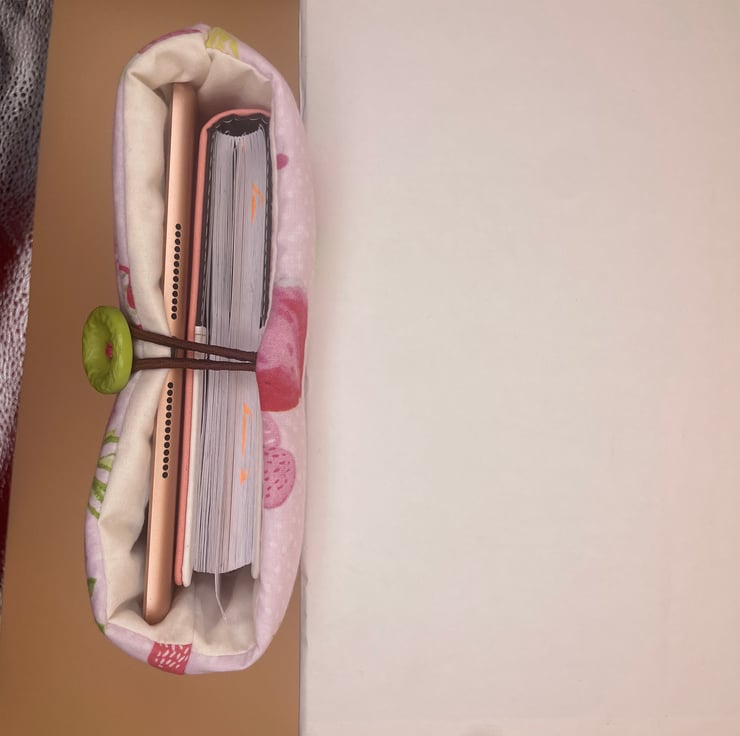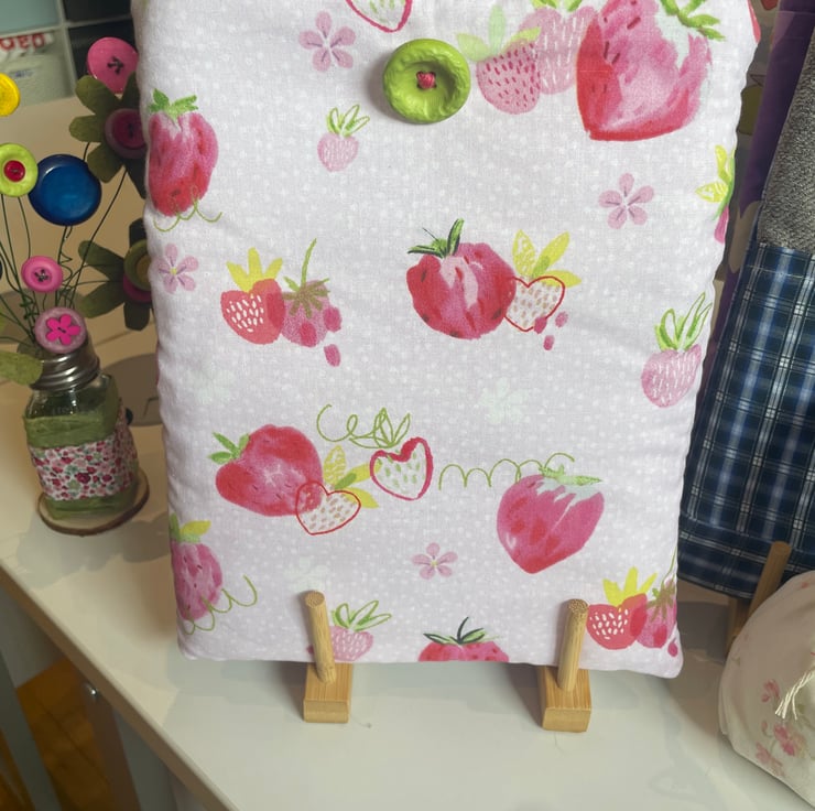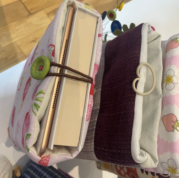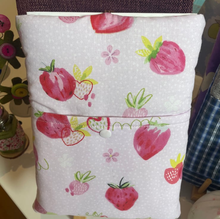 This lovely book sleeve is hand made with predominantly recycled materials. Some parts have newly sourced materials (e.g., buttons, thread and hair ties etc). It is 8 x 10 inches (approx) This has a pocket on one side for additional items such as pens, notebooks or snacks. These are so handy and such a unique quality handmade gift that really shows you care.