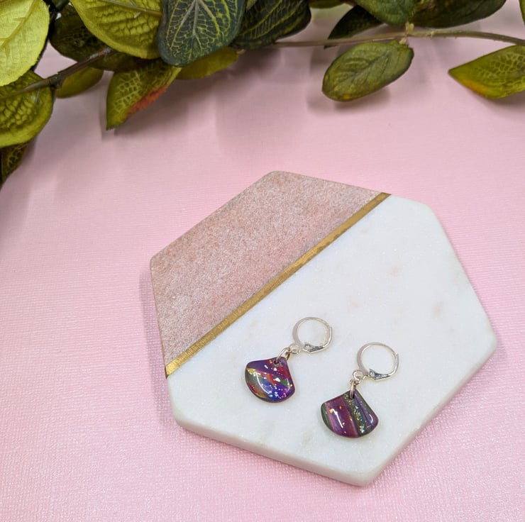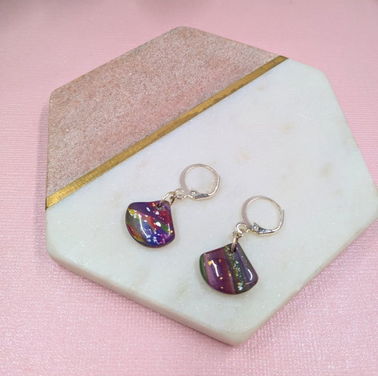 These eye-catching earrings feature a distinctive fan shape with bold, abstract patterns in polymer clay. Each earring is carefully finished with a smooth resin layer to enhance the colours and design. What makes "Adela" extra special is that only two pairs were ever made – and one has already found its happy owner! This means you'll be owning a truly rare piece of handmade art.