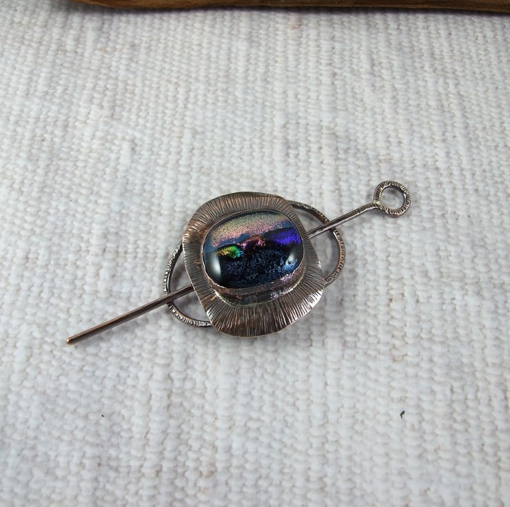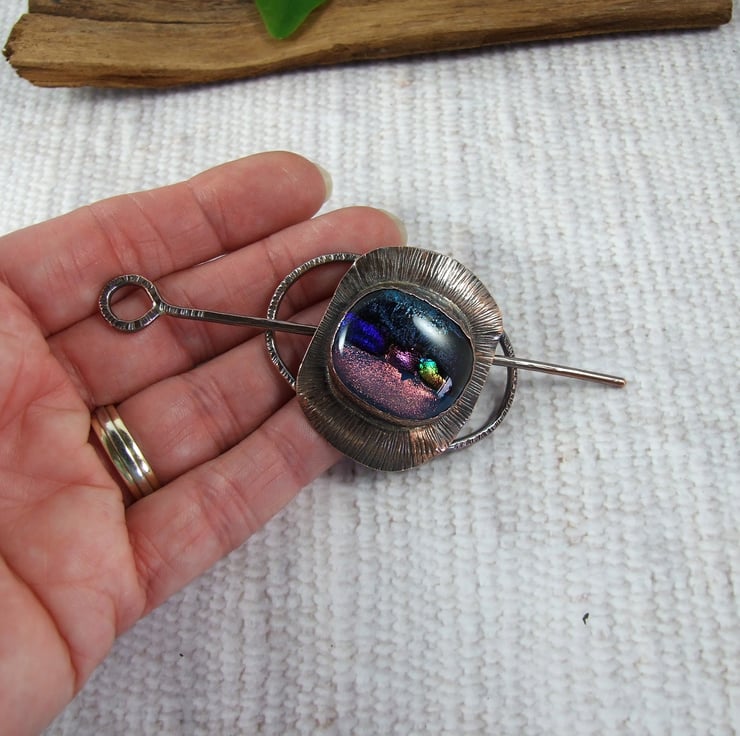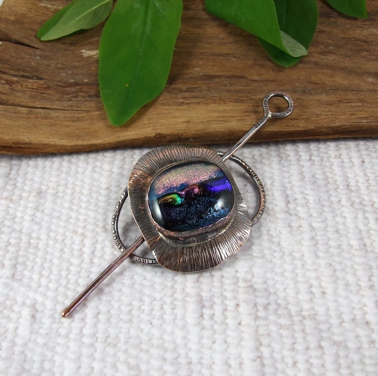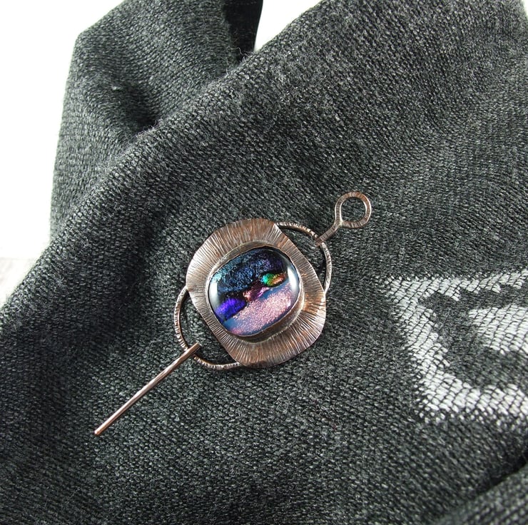 The shawl pin is a one off design in a free form style with a copper base and pin. I created the base by shaping 2mm copper wire into an oval shape, then creating a setting for the glass cabachon. I made the dichroic glass cabachon from small fragments of patterned and coloured glass which has then been fused in my kiln.