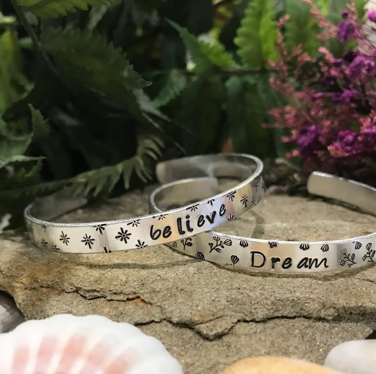 This hand stamped skinny aluminium cuff bangle with 'Believe' wording and star detail is perfect for everyday wear and stacking with other bracelets.