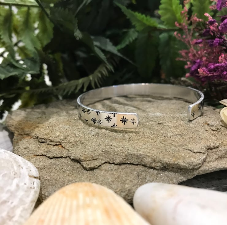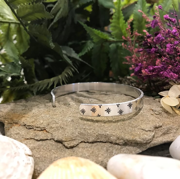 The wording and star detail is hand stamped into the bracelet by me then the bracelet is bent into shape and polished.