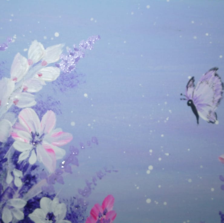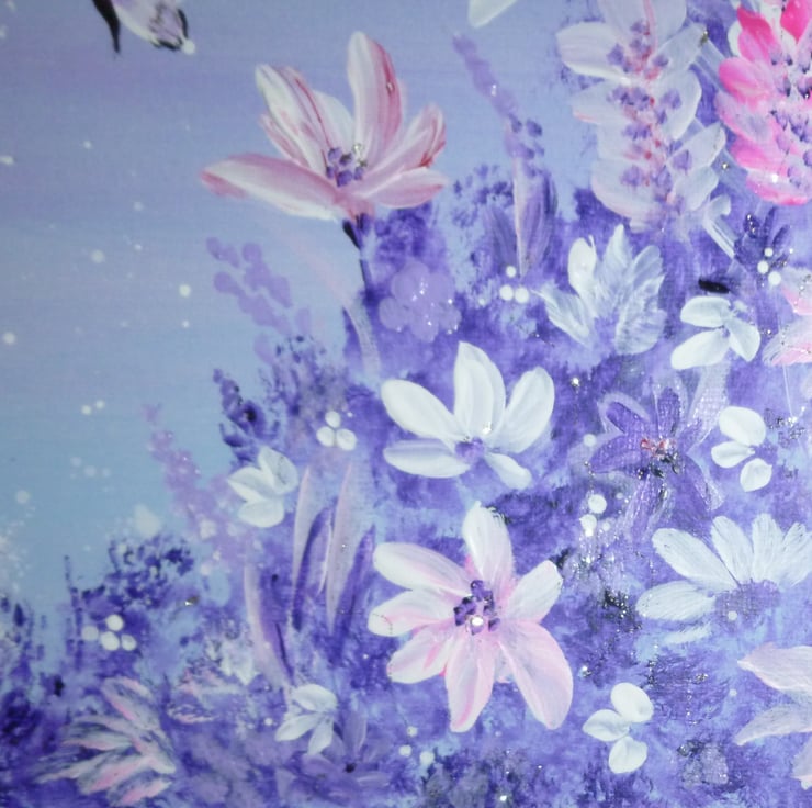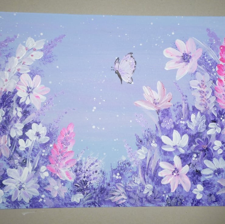 Painted on solid canvas board with artist quality acrylic paints and a touch of glitter.