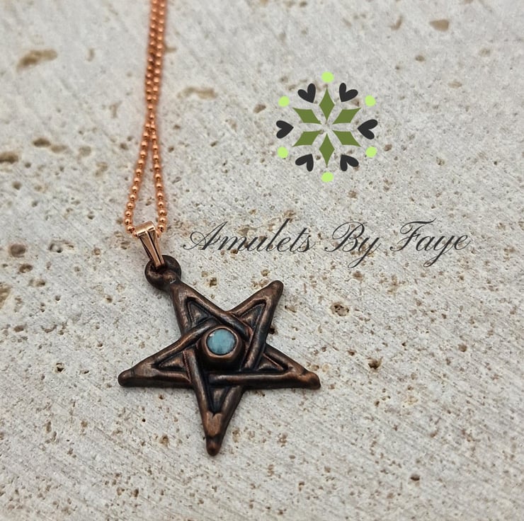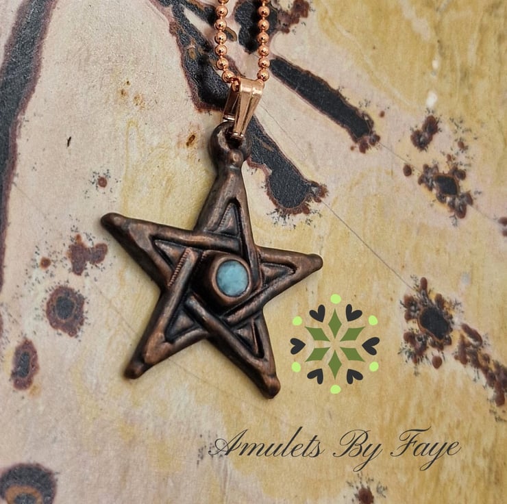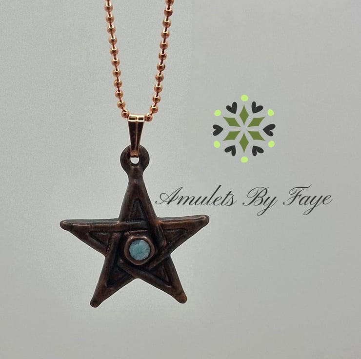 Recycled Copper Pentagram with Amazonite Gemstone Pendant Necklace.