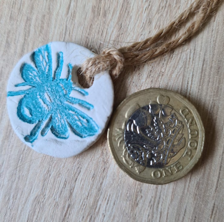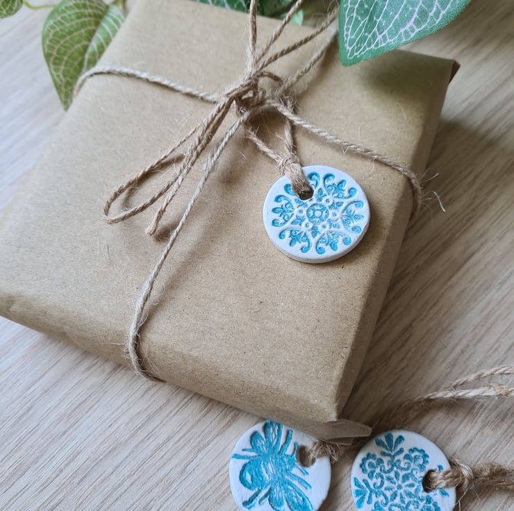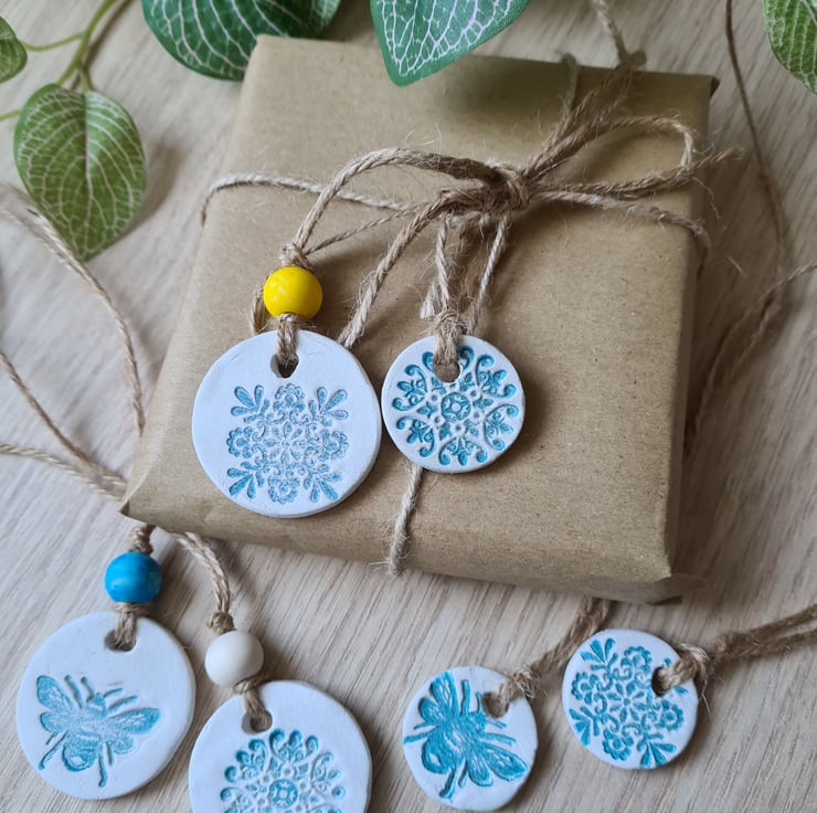 These gift tags have been individually handmade from air drying clay, each stamped with a blue design, varnished and finished with jute twine, which is left untied to use how you wish. You can choose two the same or two different designs - see options.
