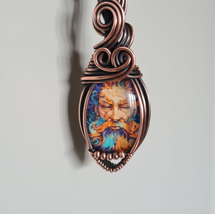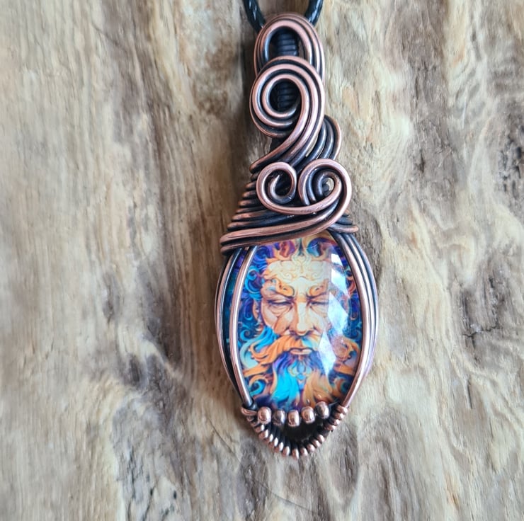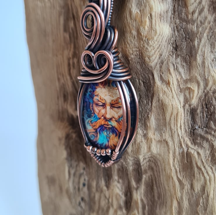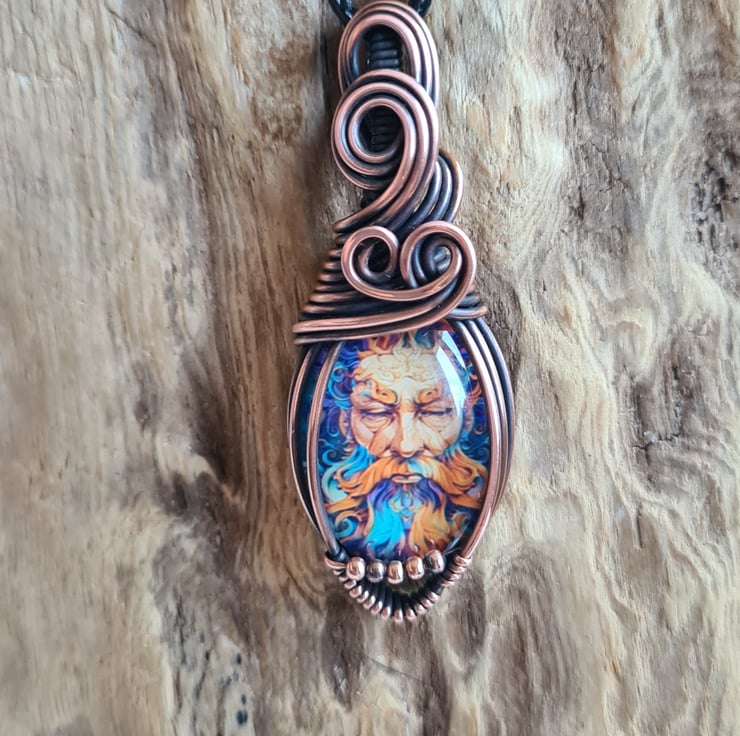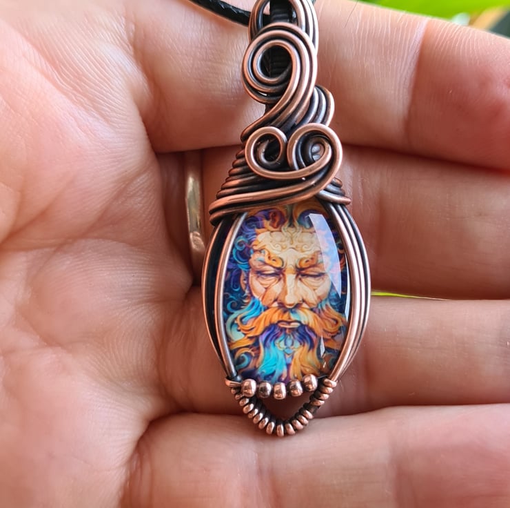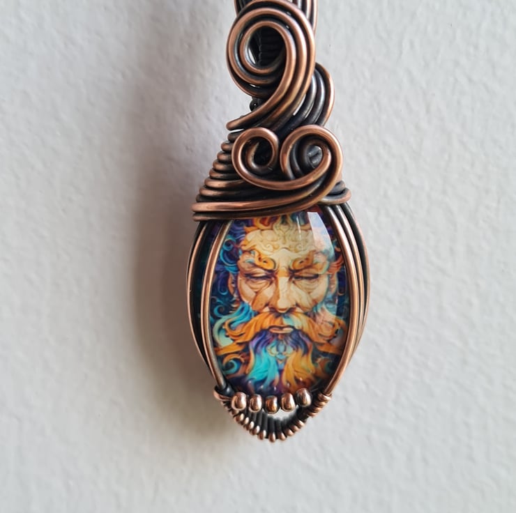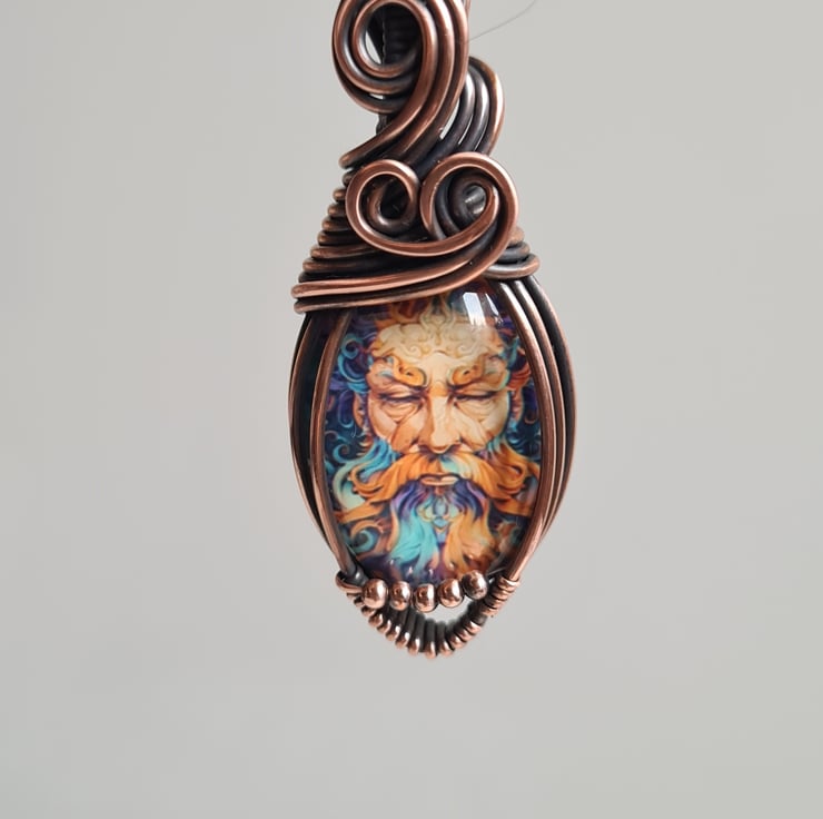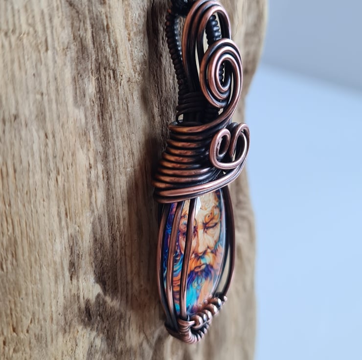 I have handcrafted this really unique pendant using this glass cabochon featuring this very cool Colourful Wise Man design, which I have then wrapped with antiqued copper.