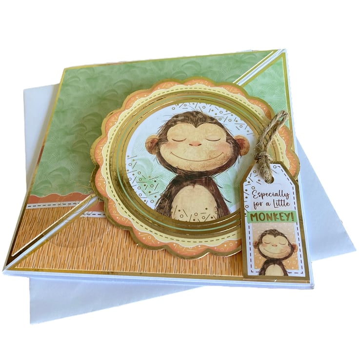 The card features a cute monkey design layered onto mirror card. Gold foiled toppers featuring a cheeky monkey and the message Especially for a Little Monkey have been added along with an acetate panel with a gold monkey outline.