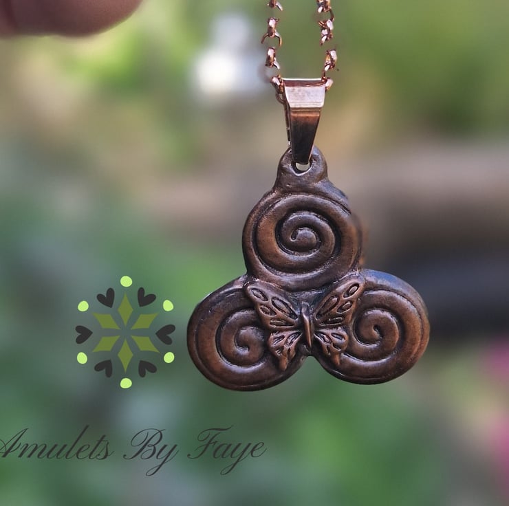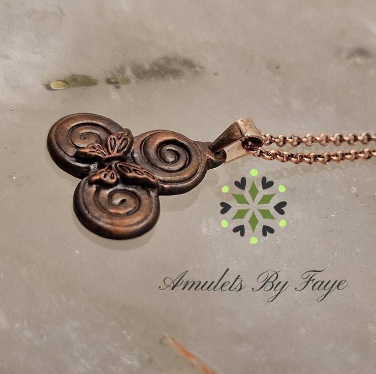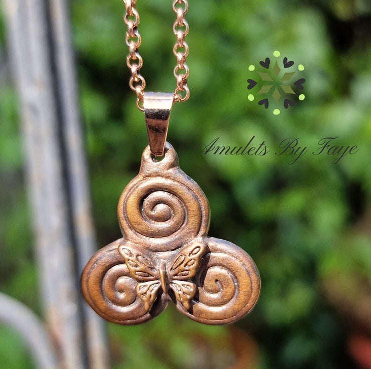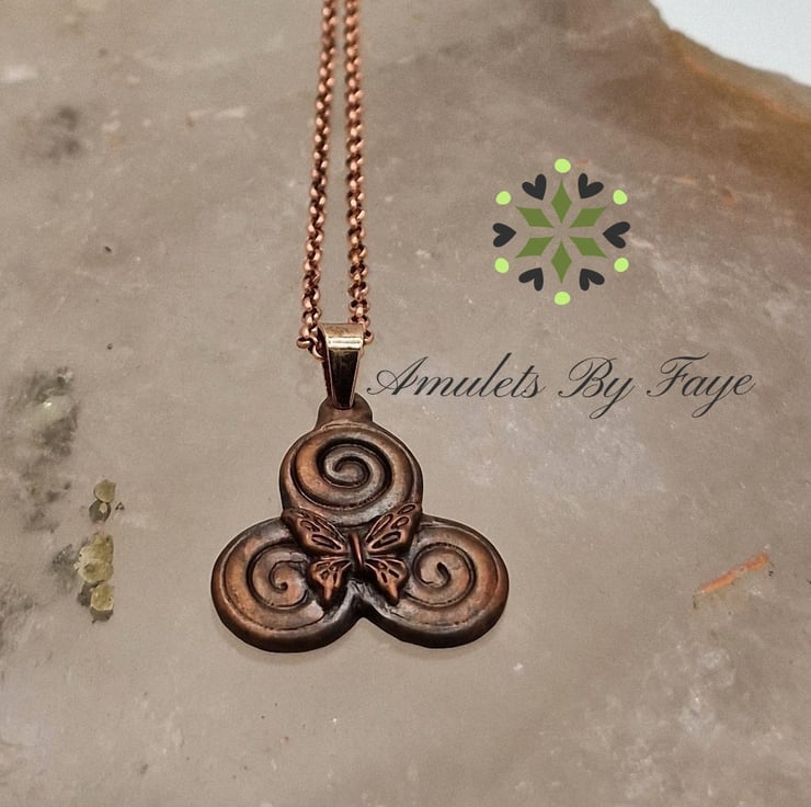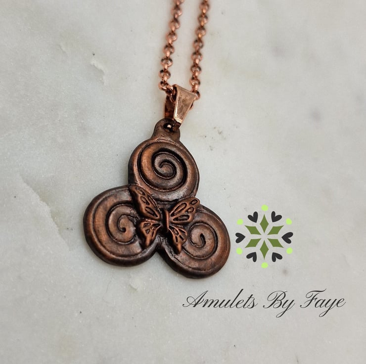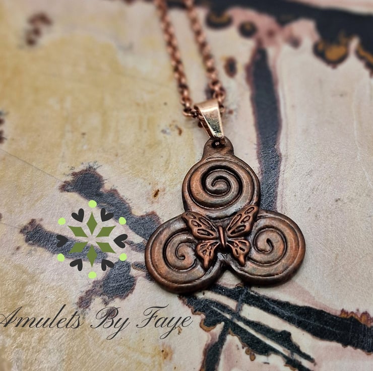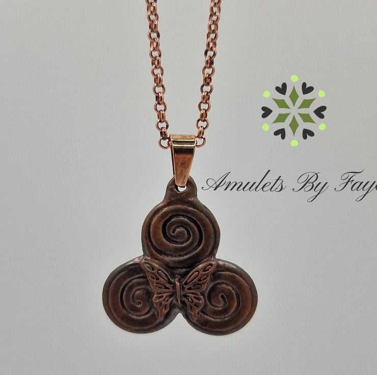 Recycled Copper Triskele Pendant with Butterfly in Centre, Necklace.