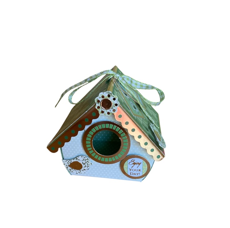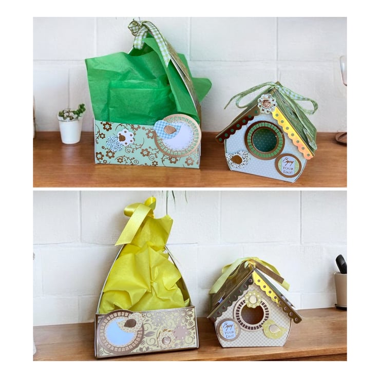 The little boxes have been made from decorative card and shaped to form a bird house and then decorated with a die cut bird, little flowers and birthday wishes. A coordinated ribbon has been added to the roof.