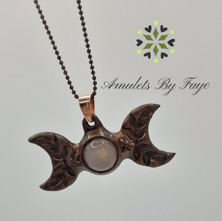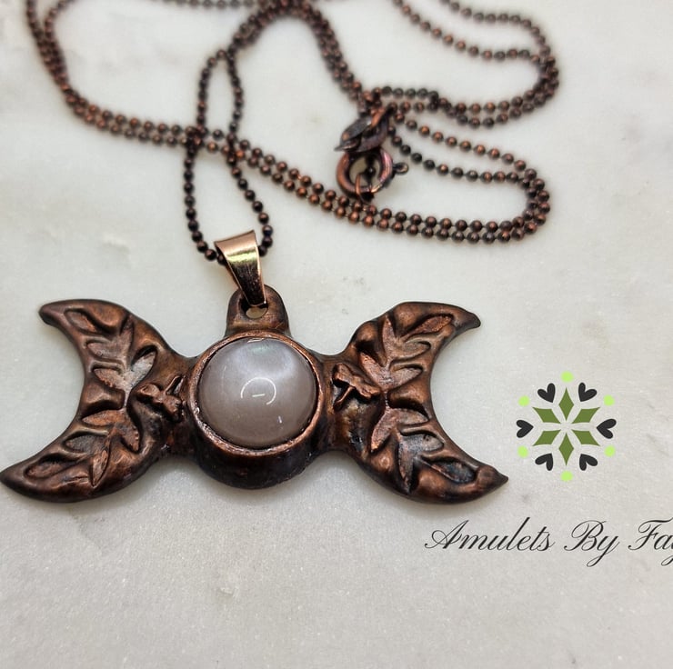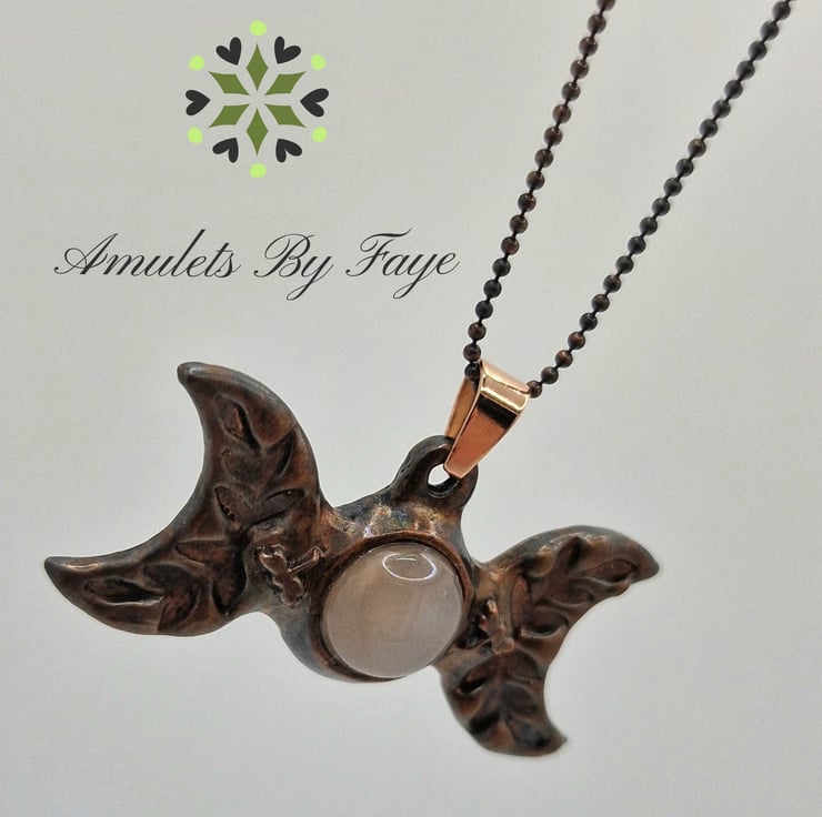 Copper Triple Moon with Peach Moonstone Gemstone, Dragonflies Pendant Necklace.