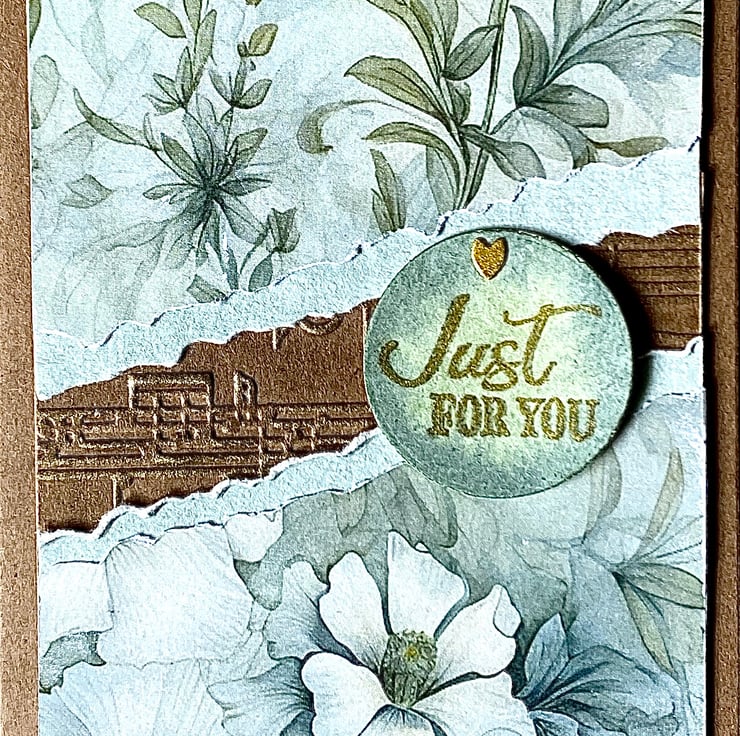 A peaceful, layered card inspired by woodland greenery and soft vintage textures. Featuring hand-torn papers, embossed and inked gold musical detail and a calming palette of greens and browns. You can choose to have it with the “Just for You” sentiment, or left blank on the front for more flexibility. Ideal for birthdays, notes of appreciation, or simply to say hello.