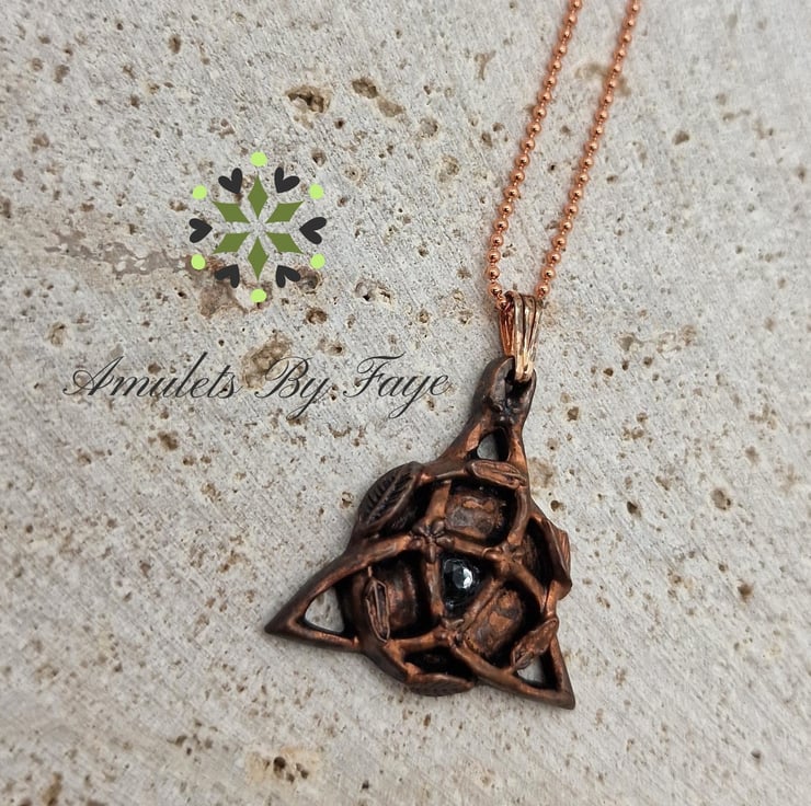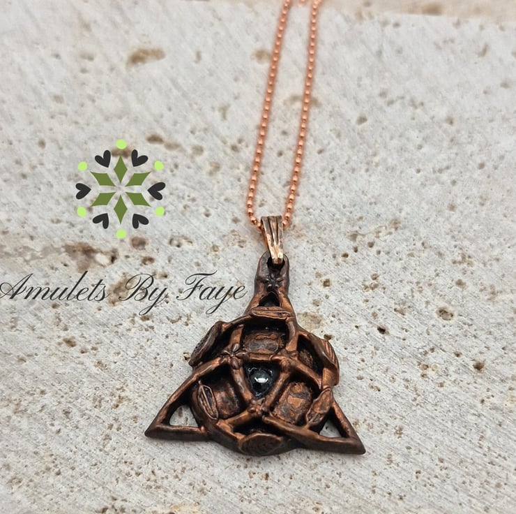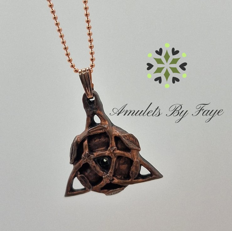 Copper Triquetra with Leaves, Flowers and A Peridot Gemstone Pendant Necklace.