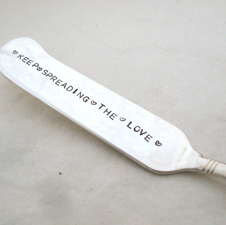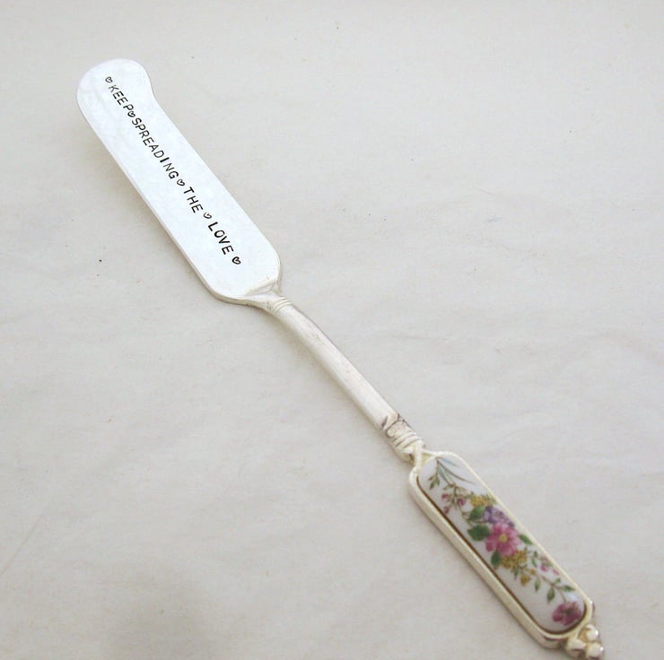 A hand stamped stainless steel butter spreader with a pretty floral ceramic insert on the handle and the wording 'KEEP SPREADING THE LOVE' punctuated with tiny hearts on the blade. A nice little wedding, anniversary or thank-you gift, maybe as part of a hamper with butter, cheese and crackers. We could all do with spreading a little more love right now...